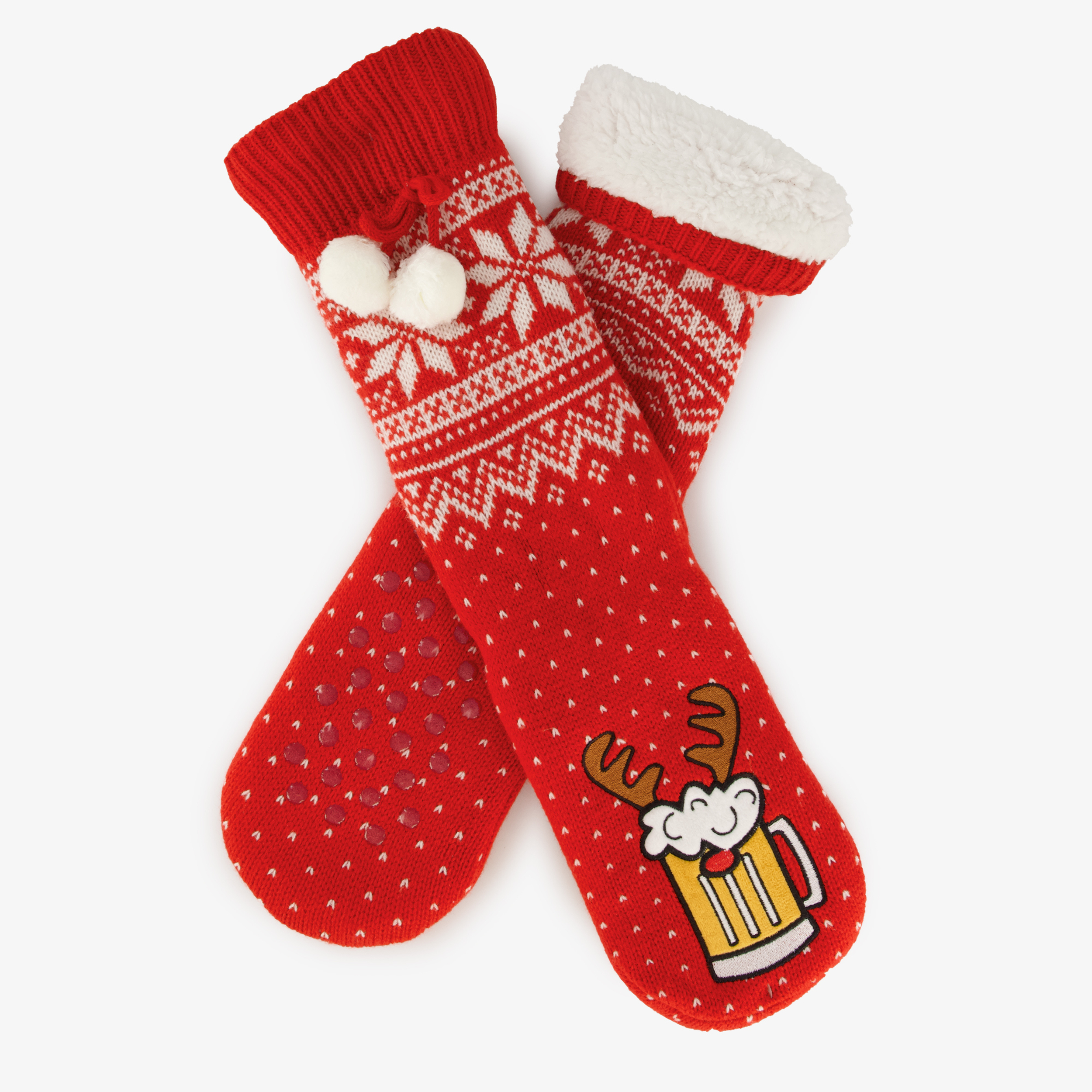 1 paar kerstsokken voor heren met een grappige print van een bierglas en pompons. Deze huissokken hebben een warme, zachte voering en antislip aan de onderzijde. Gemaakt van 100% polyester, met een buitenzijde van 100% acryl.