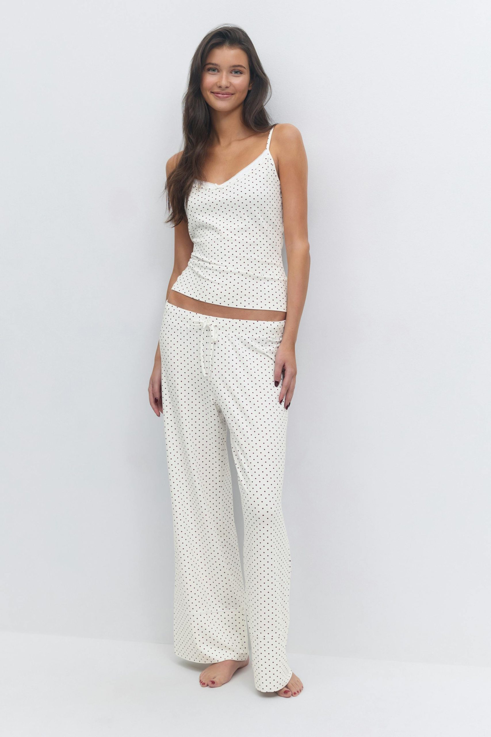 Zachte tank met een gestippeld patroon. De tank is wit en heeft een nauwsluitende pasvorm. Het heeft een elastisch materiaal, aanpasbare schouderriemen, een kantrand rond de halsopening en een boog detail aan de voorkant.
