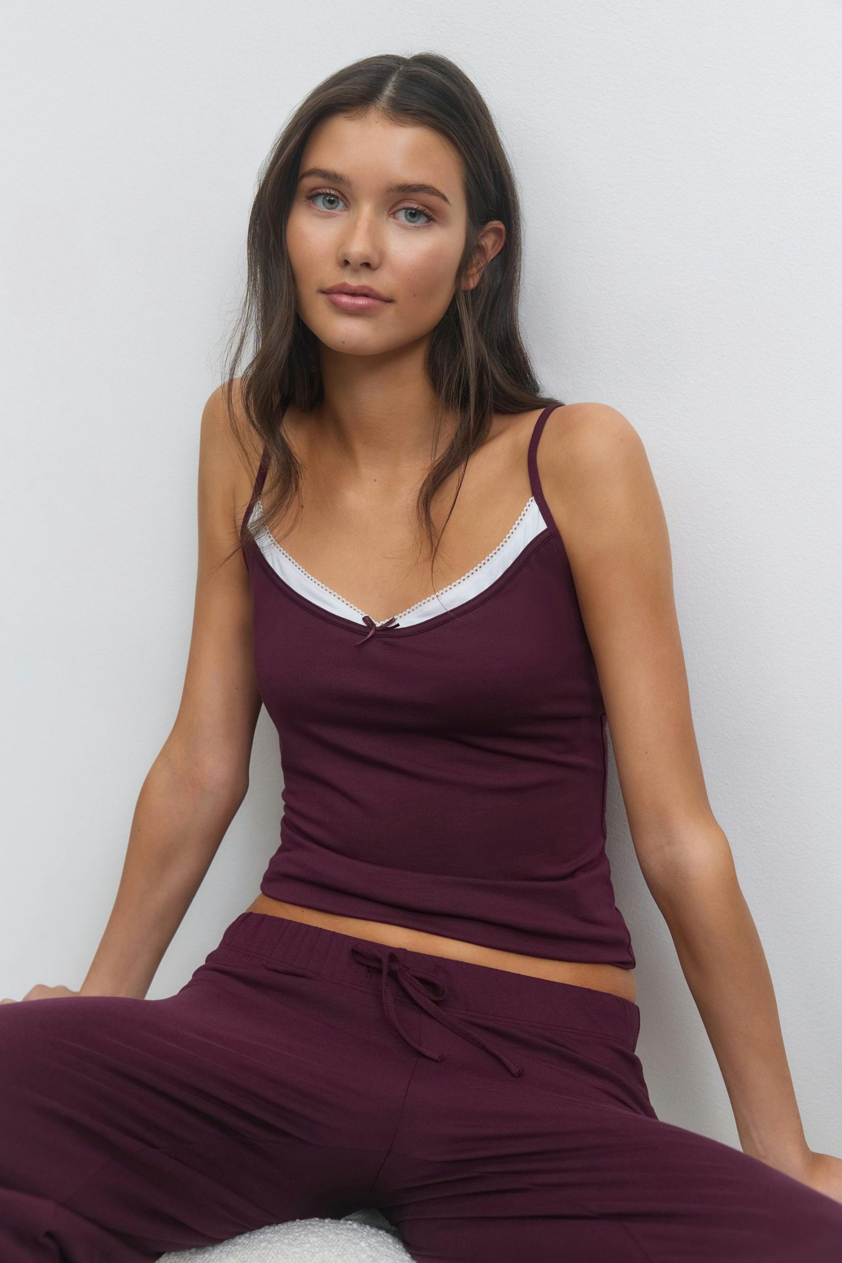 Zachte tank met een nauwsluitende pasvorm. De tank is wijnrood en heeft een elastisch materiaal. Het heeft aanpasbare schouderriemen, een kantrand rond de halsopening en een boog detail aan de voorkant.