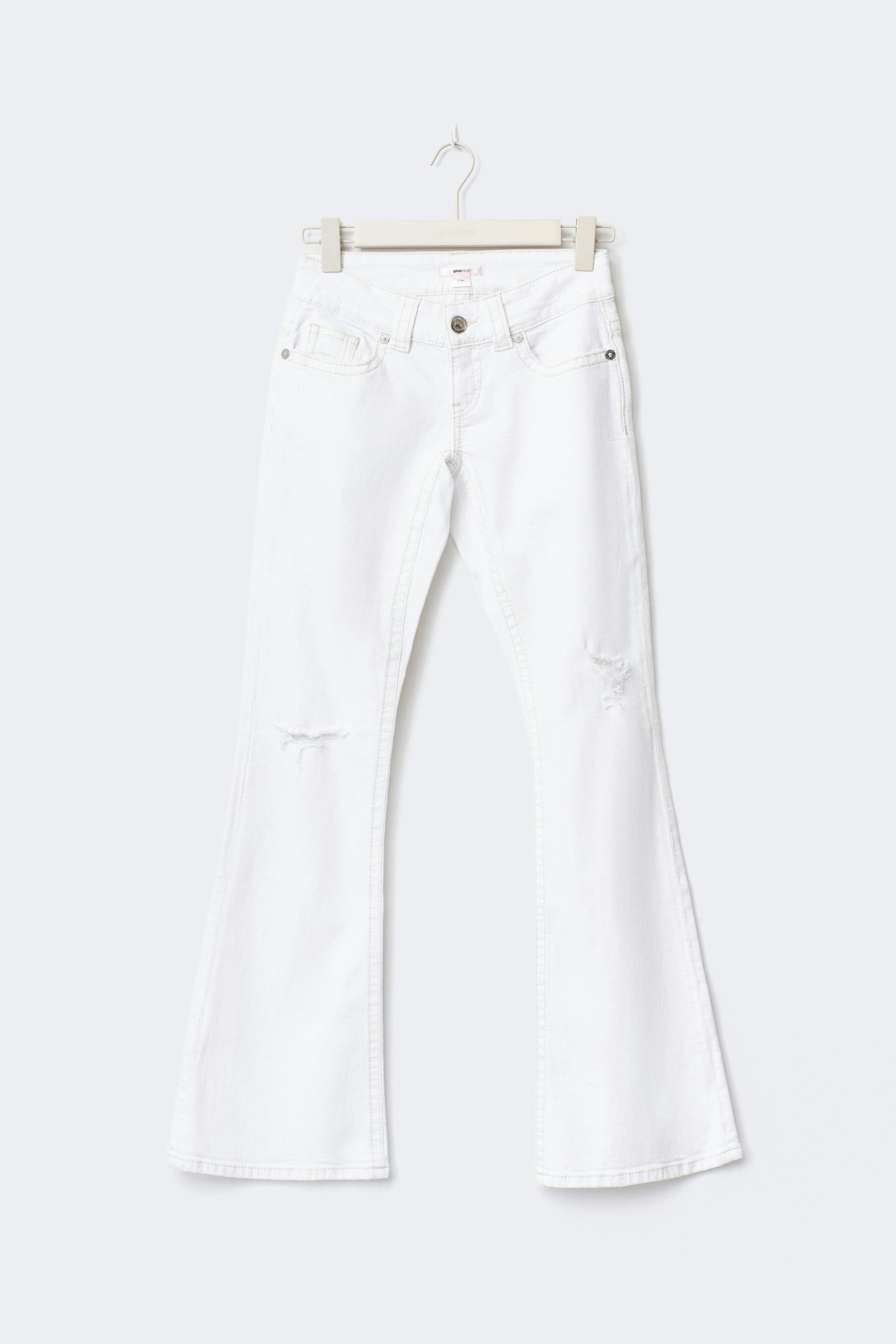 Flare jeans met lage taille. De spijkerbroek is wit en heeft uitlopende pijpen met volledige lengte. Het heeft lage stretch, gulp, riemlussen en zakken aan de voor- en achterzijde.