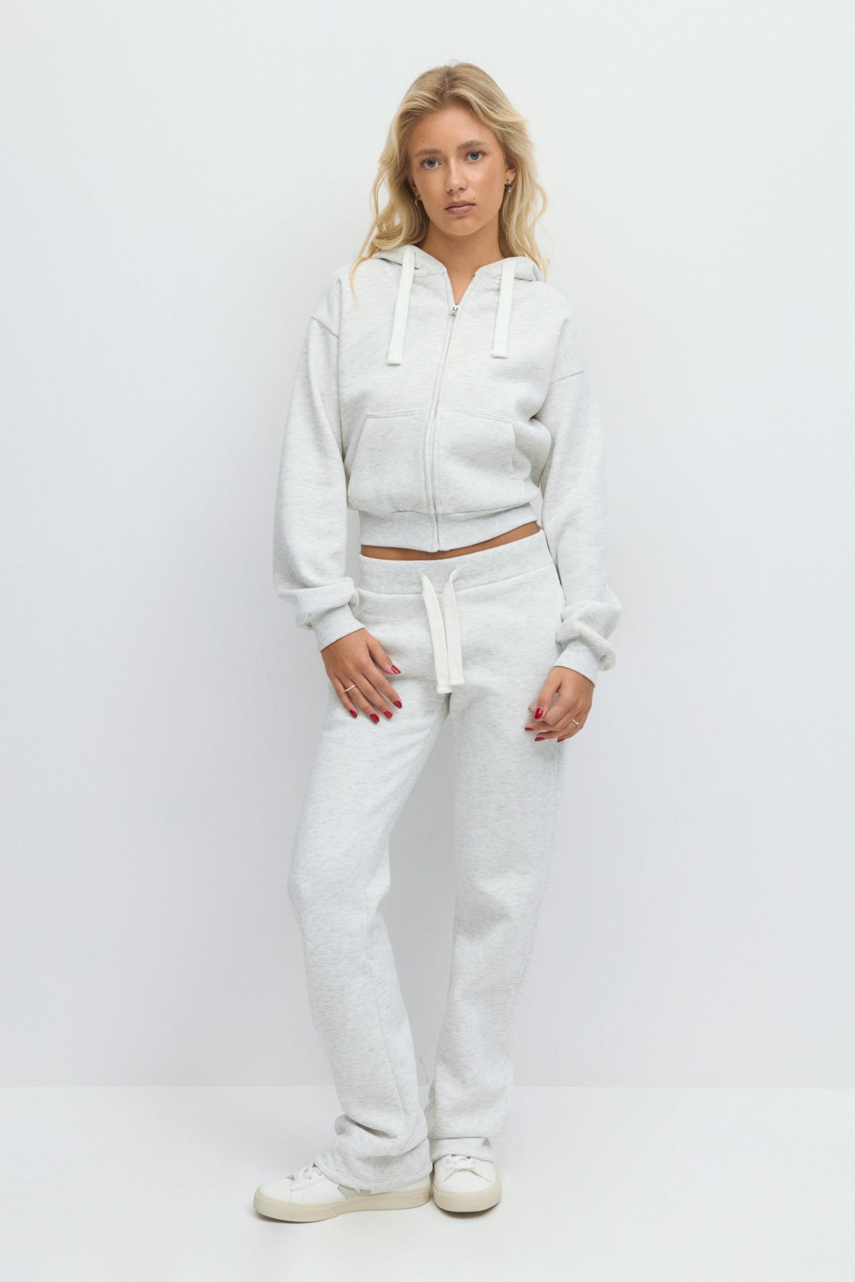 Joggingbroeken met een lage taille en achterzakken. De broeken zijn grijs en hebben verstelbare trekkoorden aan de voorkant. Het heeft brede broekspijpen, zakken in de zijden, elastiek aan de taille en normale pasvorm.