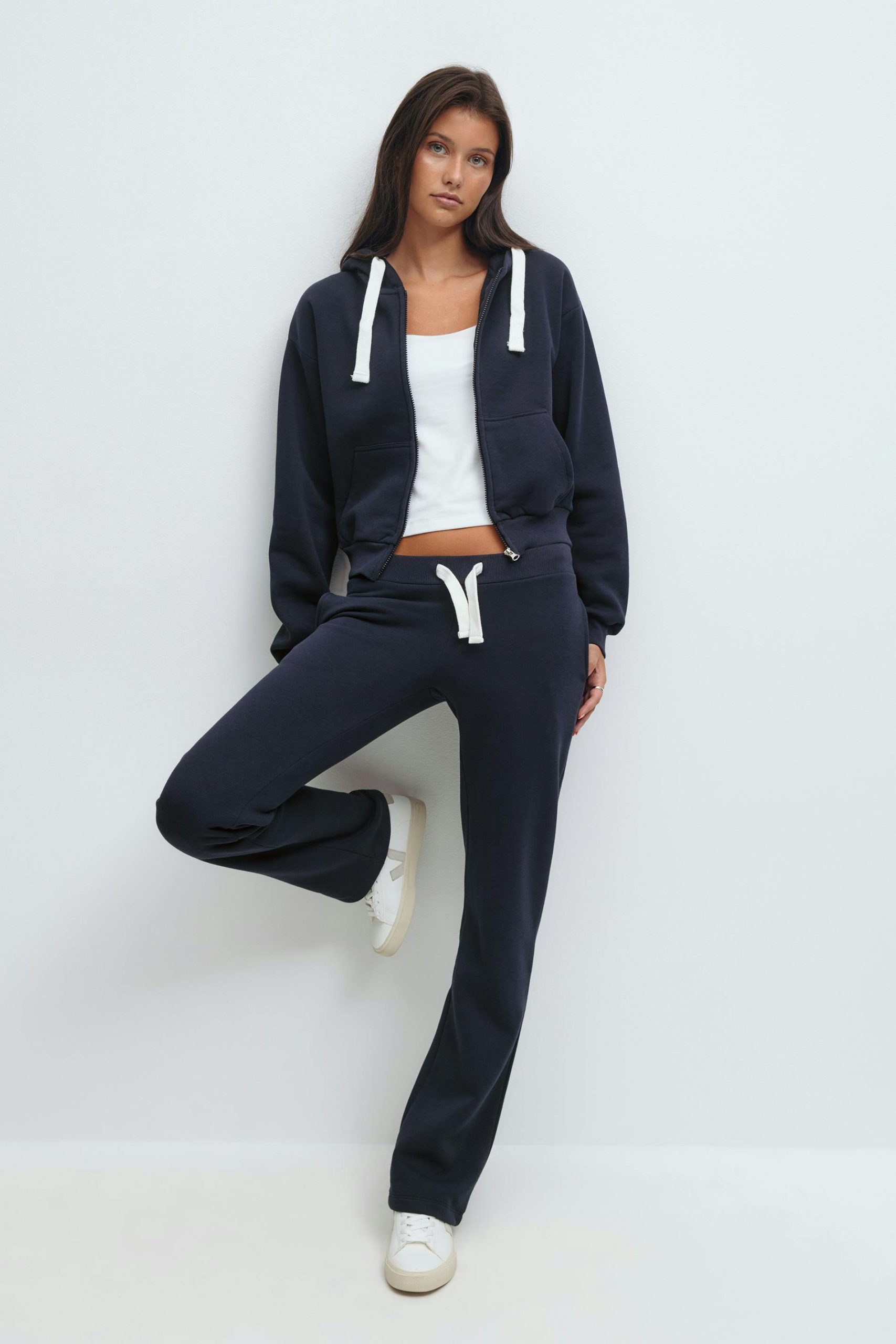 Joggingbroeken met een lage taille en achterzakken. De broeken zijn marineblauw en hebben verstelbare trekkoorden aan de voorkant. Het heeft brede broekspijpen, zakken in de zijden, elastiek aan de taille en normale pasvorm.