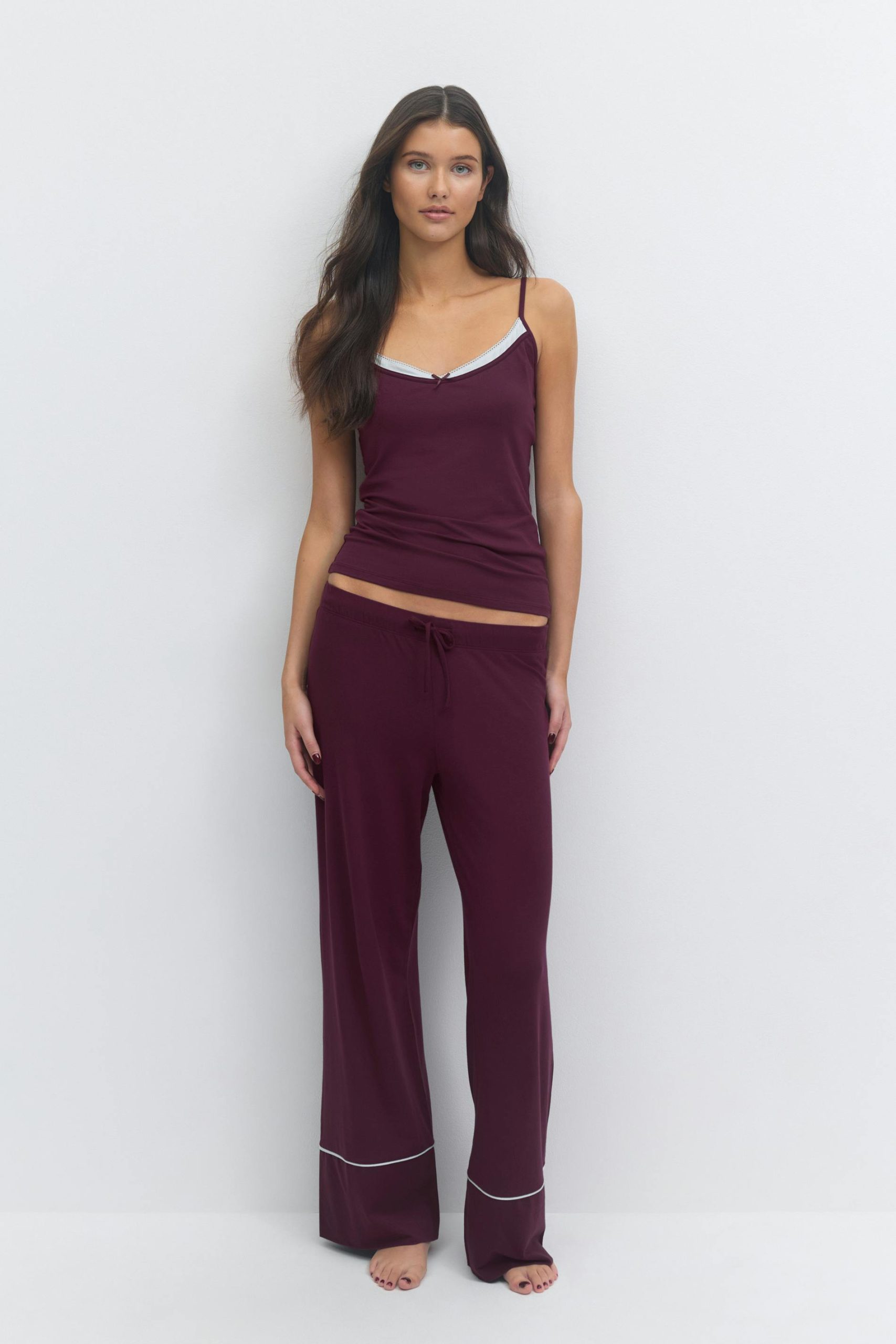 Pyjamabroek met volledige lengte. De pyjamabroek is donkerrood en heeft een rechte pasvorm. Het heeft een elastisch en zacht materiaal en een normale taille.