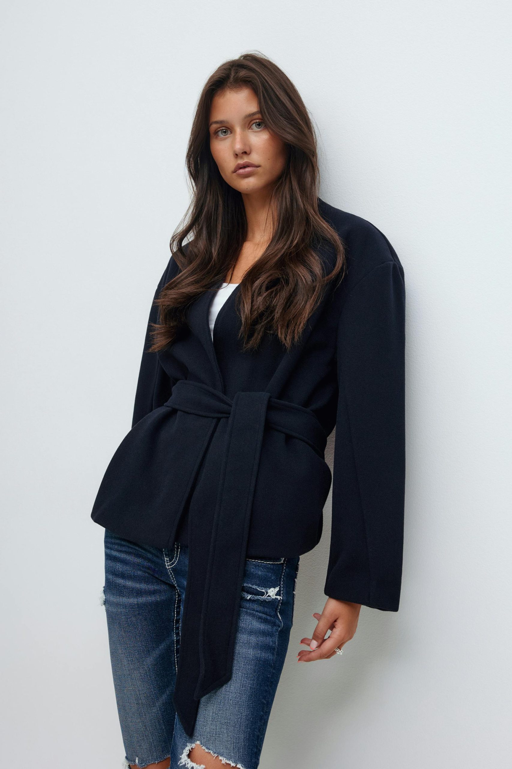 Korte jas met zelfbindende riem aan de taille. De jas is marineblauw en heeft lange mouw. Het heeft v-hals, hangende schouder en spleet op het achterpand. Volledig gevoerd.