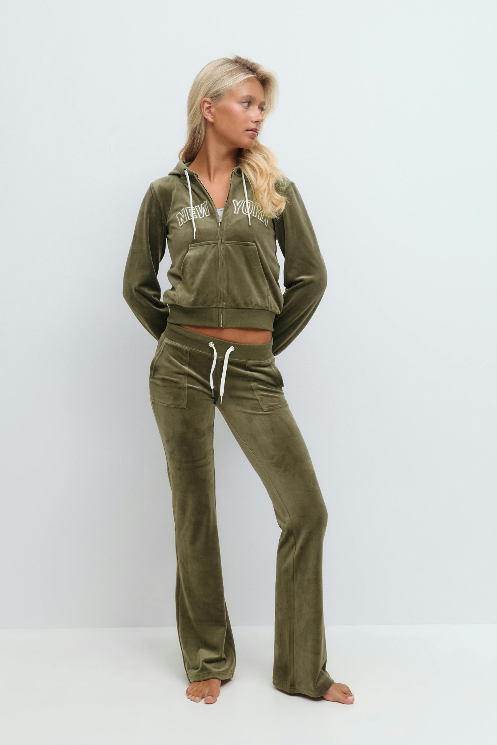 Loungebroek van velours met een lage taille. De broek is groen en heeft rechte pijpen. Het heeft een elastische tailleband van geribbelde kwaliteit met een trekkoord aan de taille en zakken aan de voor- en achterzijde.