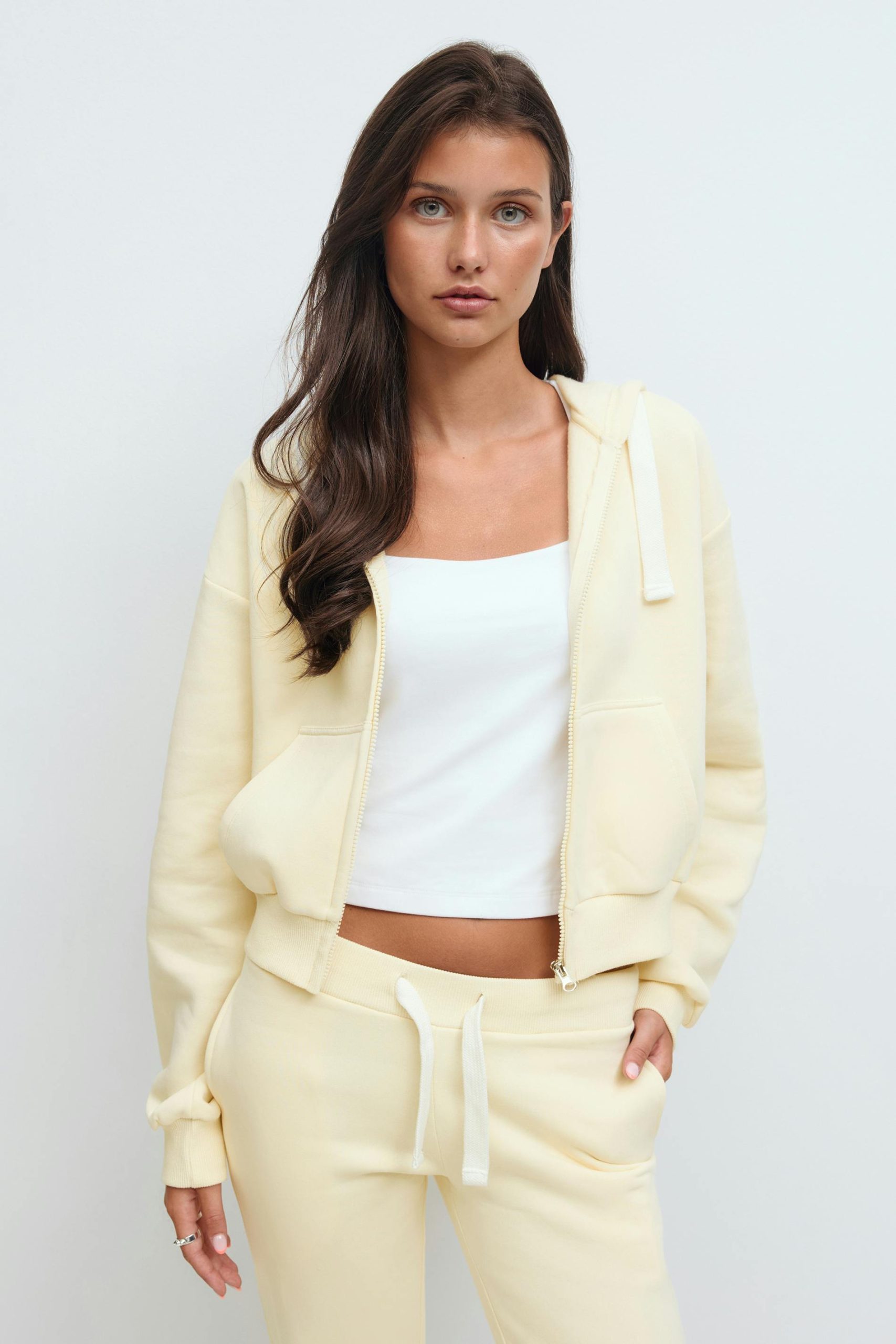 Hoodie met rits aan de voorkant. De sweater is geel en heeft capuchon met trekkoord. Het heeft zakken aan de voorkant, ribbels aan de mouwuiteinden en aan de onderkant, zachte stof en ruimere pasvorm.