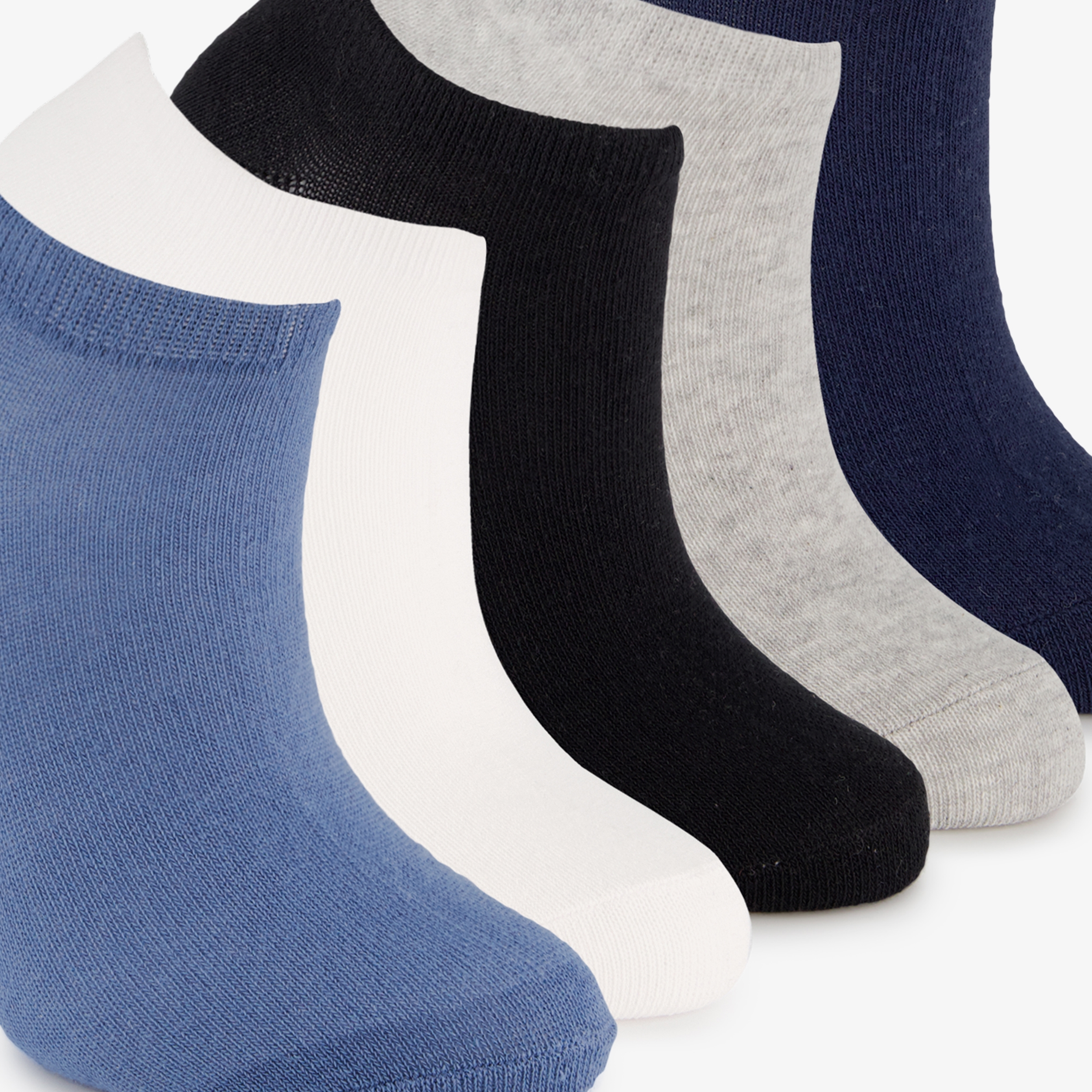 5 paar sneakersokken voor kinderen in de kleuren blauw, zwart, grijs en wit. Gemaakt van 75% katoen, 22% polyester en 3% elastaan.
