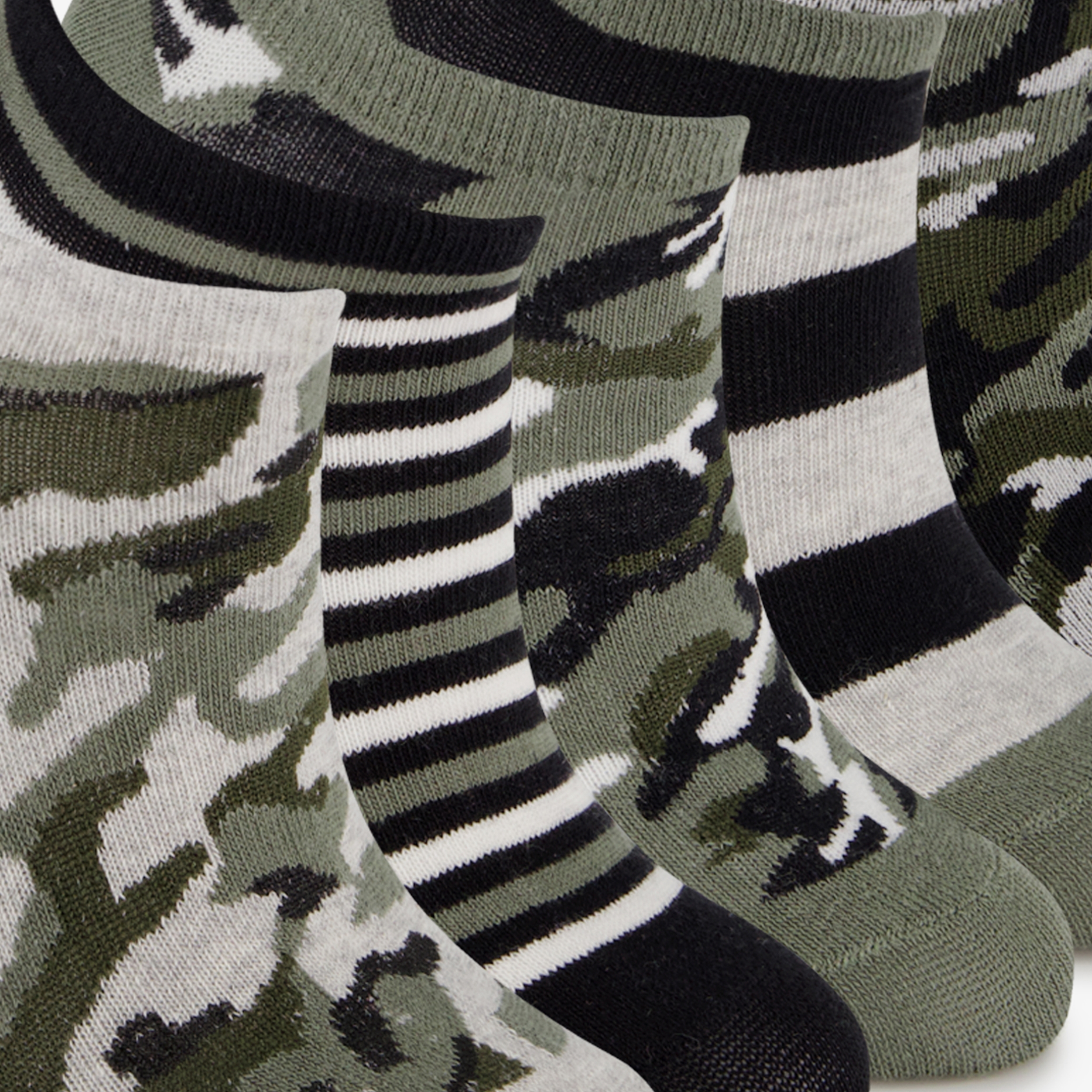 5 paar sneakersokken voor jongens met camouflageprint in de kleuren groen, grijs en zwart. Gemaakt van 75% katoen, 22% polyester en 3% elastaan.