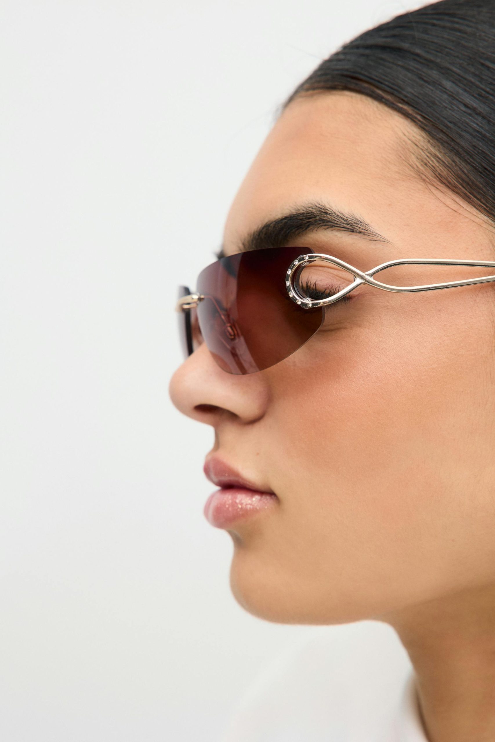 Zonnebril zonder frame met geïnspireerd op de jaren’90 ontwerp. De zonnebril is bruin en heeft smalle metalen frames met bergkristal. Het heeft aanpasbare Neuskussens en getinte glazen met UV400-bescherming.