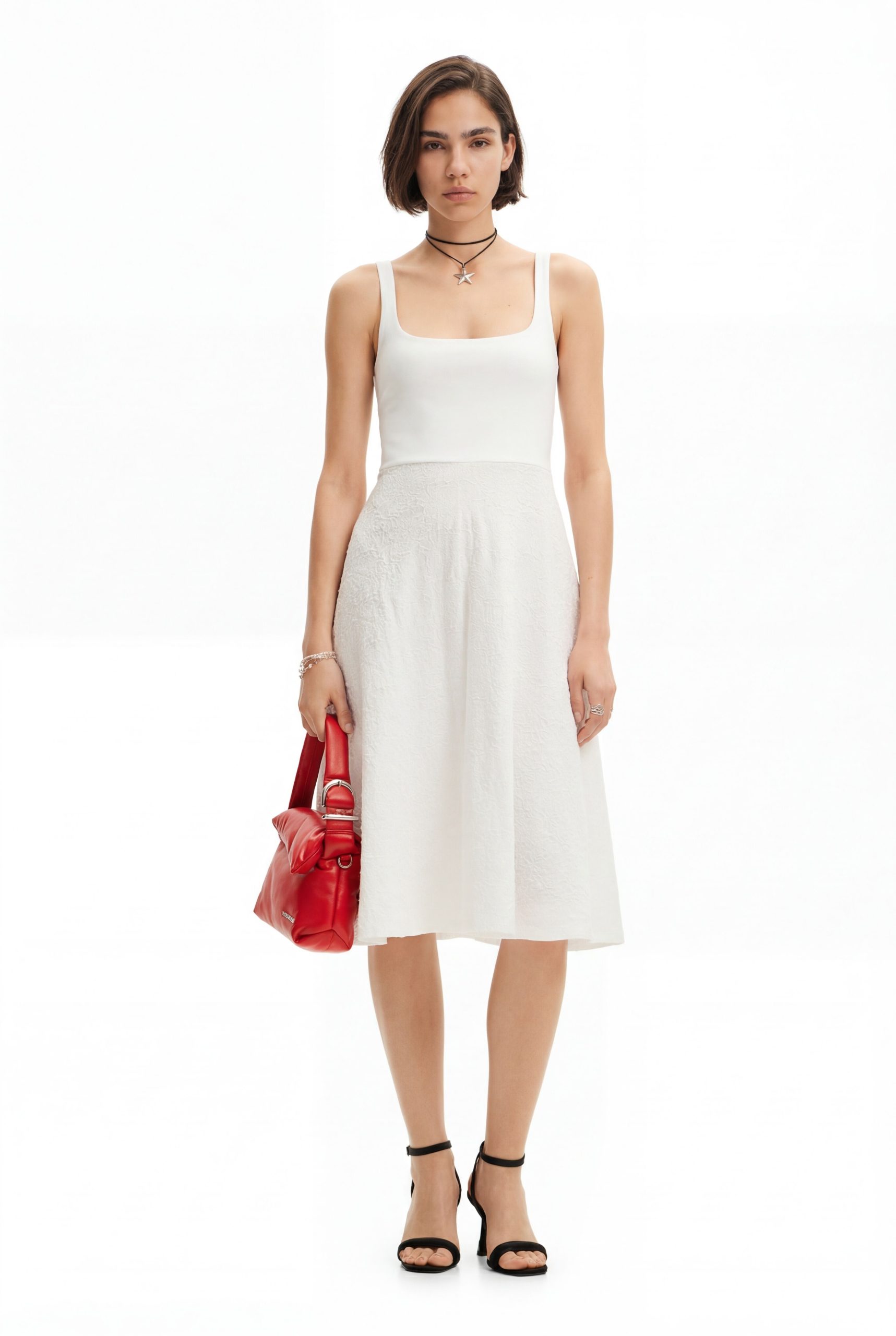 Midi-jurk met bandjes en vierkante halslijn in effen kleur met een A-lijn rok in borduureffect.