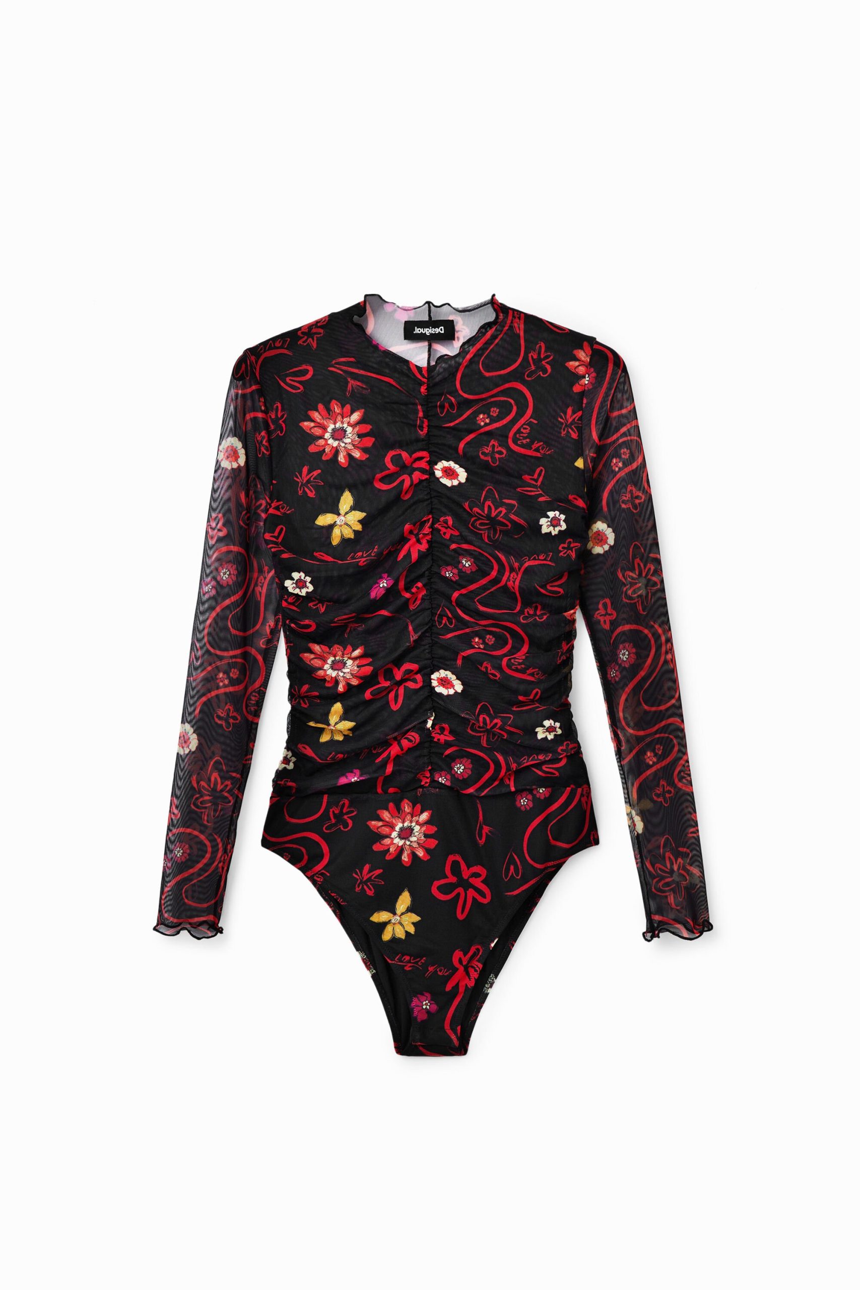 Aansluitende tulen body met lange mouwen, perkins-kraag en aangerimpelde voor- en zijkanten. Bloemenprint.
