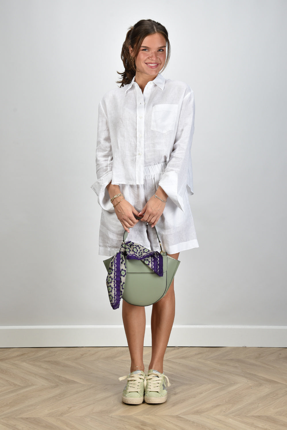 Zie hier de Academia short Sirio in bianco unito, vervaardigd uit 100% linnen voor een luchtige en elegante uitstraling. Dit model biedt een normale pasvorm en is ideaal voor diverse gelegenheden. Lise draagt maat 38/M/28 bij een lengte van 1,73m. Artikelnummer: 74DT2-020.