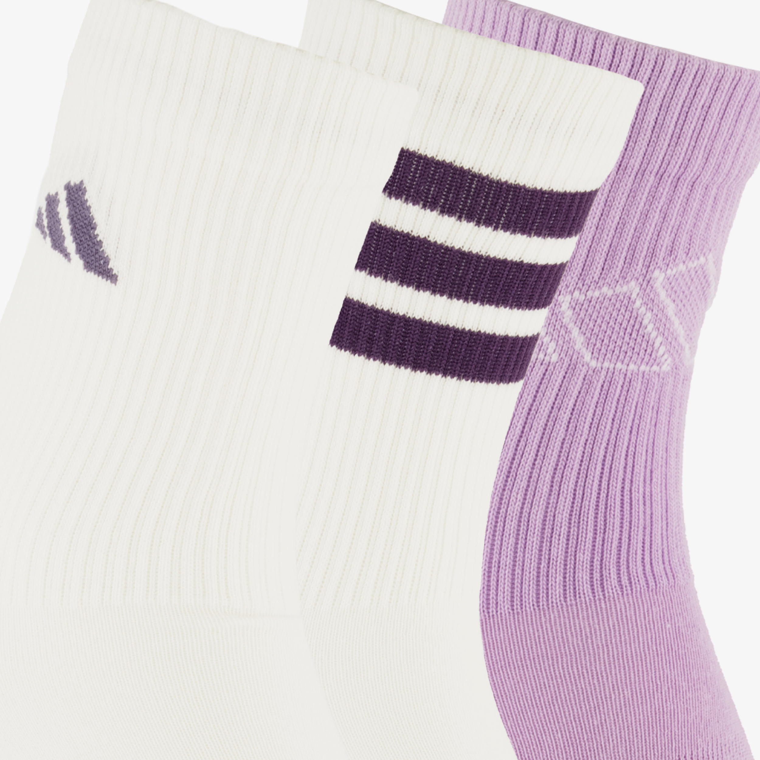 3-pack Adidas sportieve sokken in het wit met paars. Ontworpen voor comfort en prestaties. De sokken beschikken over een versterkte hiel en teen voor extra duurzaamheid en ondersteuning. Dankzij de elastische enkelband bieden ze een stabiele, nauwsluitende pasvorm. Gemaakt van 55% katoen, 42% polyester en 2% elastaan.