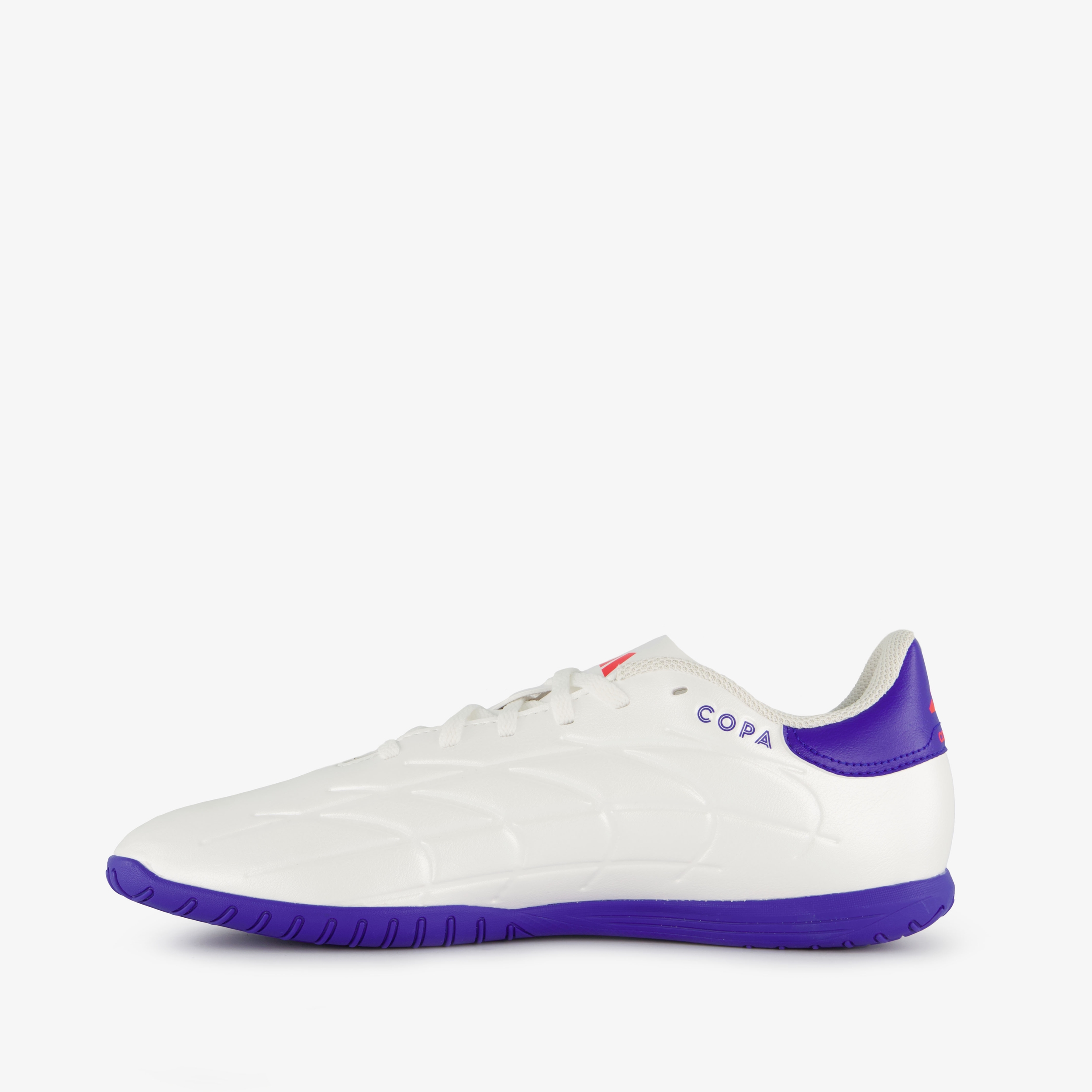 Witte Adidas Copa Pure 2 Club zaalschoenen voor heren. Het buitenwerk is gemaakt van imitatieleer, het binnenwerk van textiel en de non-marking buitenzool van rubber. Voorzien van een vetersluiting en een comfortabele binnenzool van textiel. De structuur van de buitenzool zorgt ervoor dat je snelle wendingen kan maken en maximale tractie hebt. Dit terwijl de impact op je gewrichten minimaal is zodat jij soepel kan bewegen in de zaal. Deze mooie zaalschoenen worden versierd met blauwe en oranje details en merkopdrukken op het buitenwerk. Binnenzool is uitneembaar.