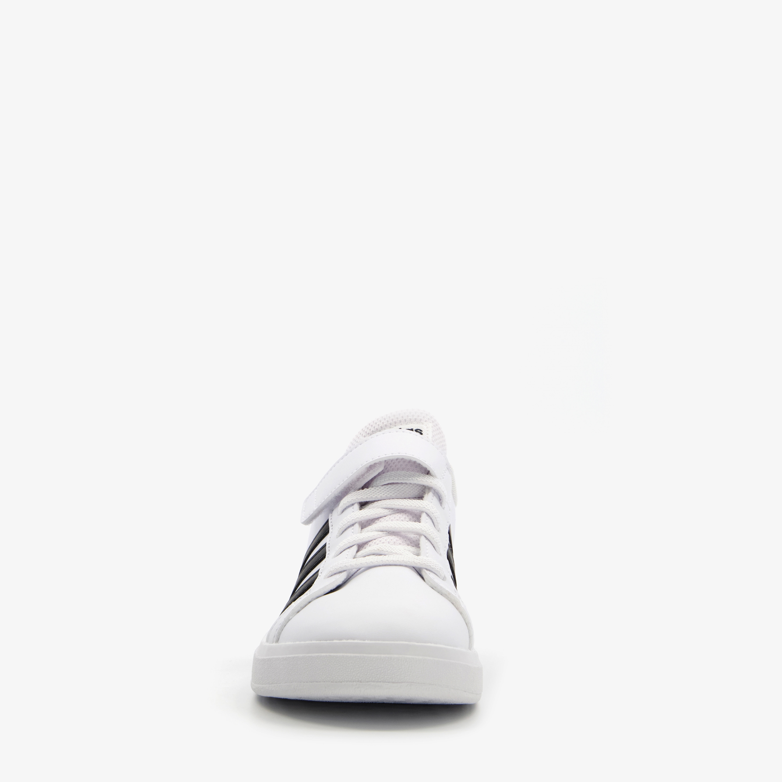 Witte Adidas Grand Court 2.0 sneakers voor kinderen. Gemaakt van imitatieleer met een binnenwerk van textiel en stevige profielzool van rubber. Voorzien van een veter- en klittenbandsluiting voor een goede pasvorm en de iconische Adidas 3-stripes in het zwart op de zijpanden. Het comfortabele voetbed is van textiel. Deze is uitneembaar.