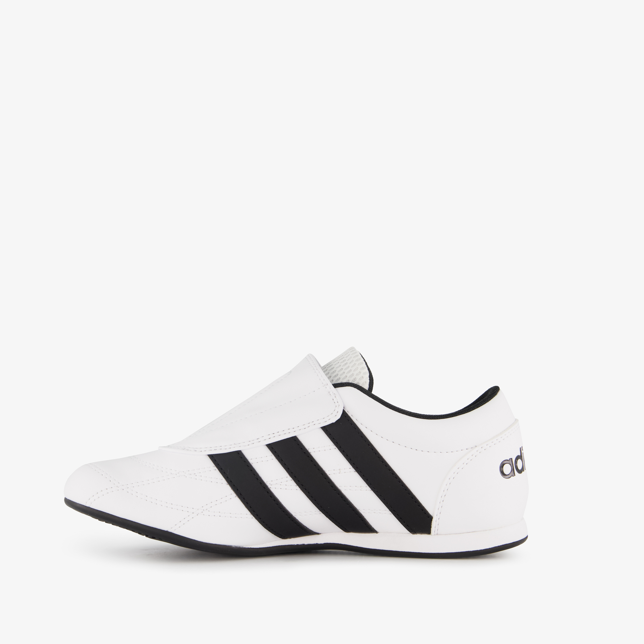 Witte Adidas Tekwen sneakers voor dames. Gemaakt van imitatieleer, een binnenwerk van textiel en een rubberen zool. De sneakers hebben een elastische sluiting en vast voetbed van textiel. Voorzien van zwarte merkaccenten op het bovenwerk.