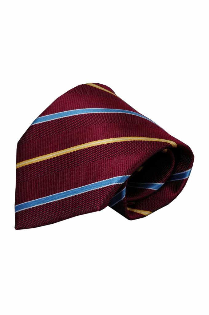 Rode stropdas m. blauwe strepen, 100% Made in Italy v. 100% Italiaanse zijde m. lusje, vanbinnen dezelfde stof, zadelsteek. Shop online bij Italian Design!