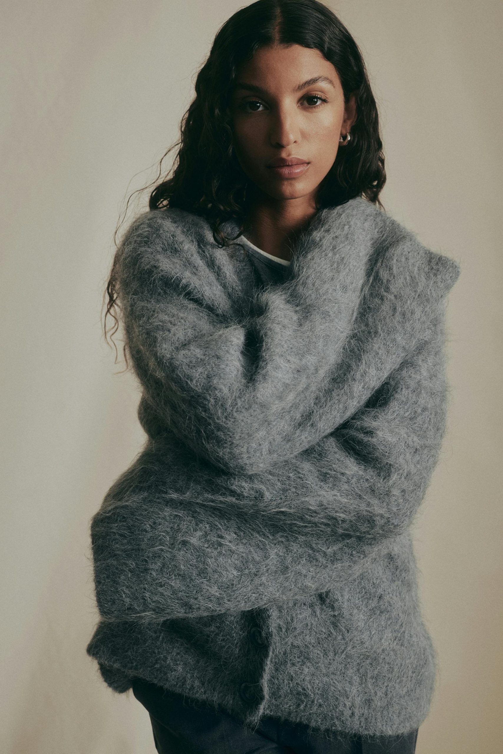 Pluizig vest met overmaatse pasvorm. Het vest is grijs en heeft knoppen aan de voorkant. Het heeft v-hals, lange mouwen en geribd gebreid materiaal aan de mouwuiteinden en aan de onderkant.