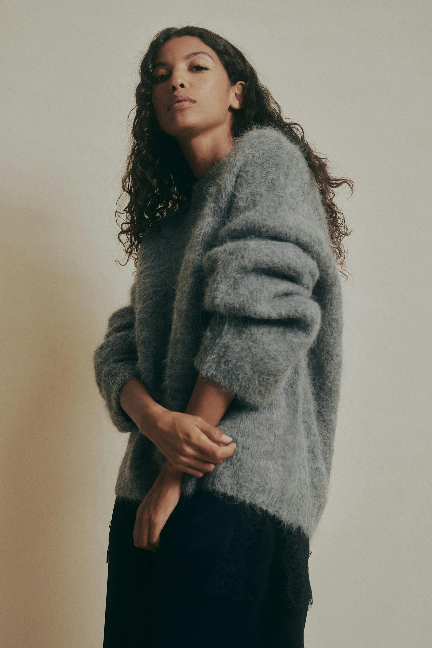 Pluizige gebreide trui van zachte alpaca mix met ruimvallende stijl. De trui is grijs en heeft ronde halslijn. Het heeft lange mouwen, normale lengte en geribd gebreid materiaal aan de mouwuiteinden en aan de onderkant.