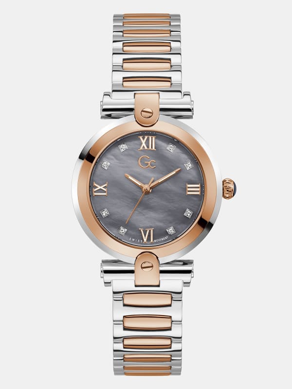 Zwitserse precisie in combinatie met Franse stijl: alle GC-horloges worden gekenmerkt door de uitstekende kwaliteit van het uurwerk en het onmiskenbare design.Kleur wijzerplaat: grijs parelmoer.Kleur kast: zilver en roségoud.Kleur bandje: zilver en roségoud.Wijzerplaat met kristallen.Materiaal kast: roestvrij staal.Vorm kast: rond.Diameter kast: 34 mm.Materiaal bandje: roestvrij staal.Sluiting bandje: vouwsluiting.Totale lengte: 190 mm.Breedte bandje: 16 mm.Uurwerk: kwarts, analoog.Voeding: batterij.Waterbestendig: 100 M.Glas: krasbestendig saffiergecoat glas.