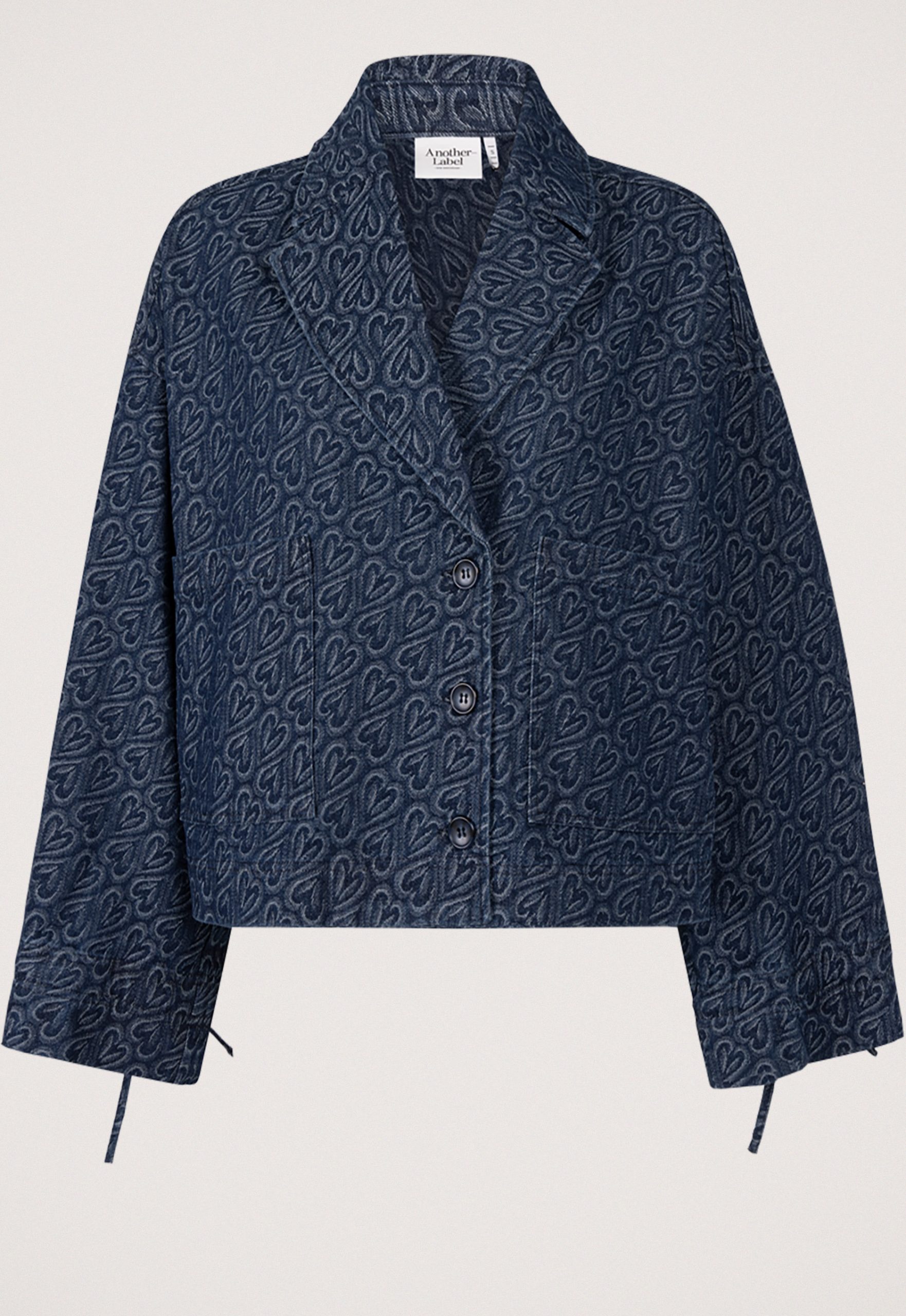 Dit is de J15-525406 Miki Blazer van het merk Another-Label. Blazer met een all-over hartjespatroon, uitgevoerd met een knoopsluiting en trekkoord details aan de mouwuiteinden.