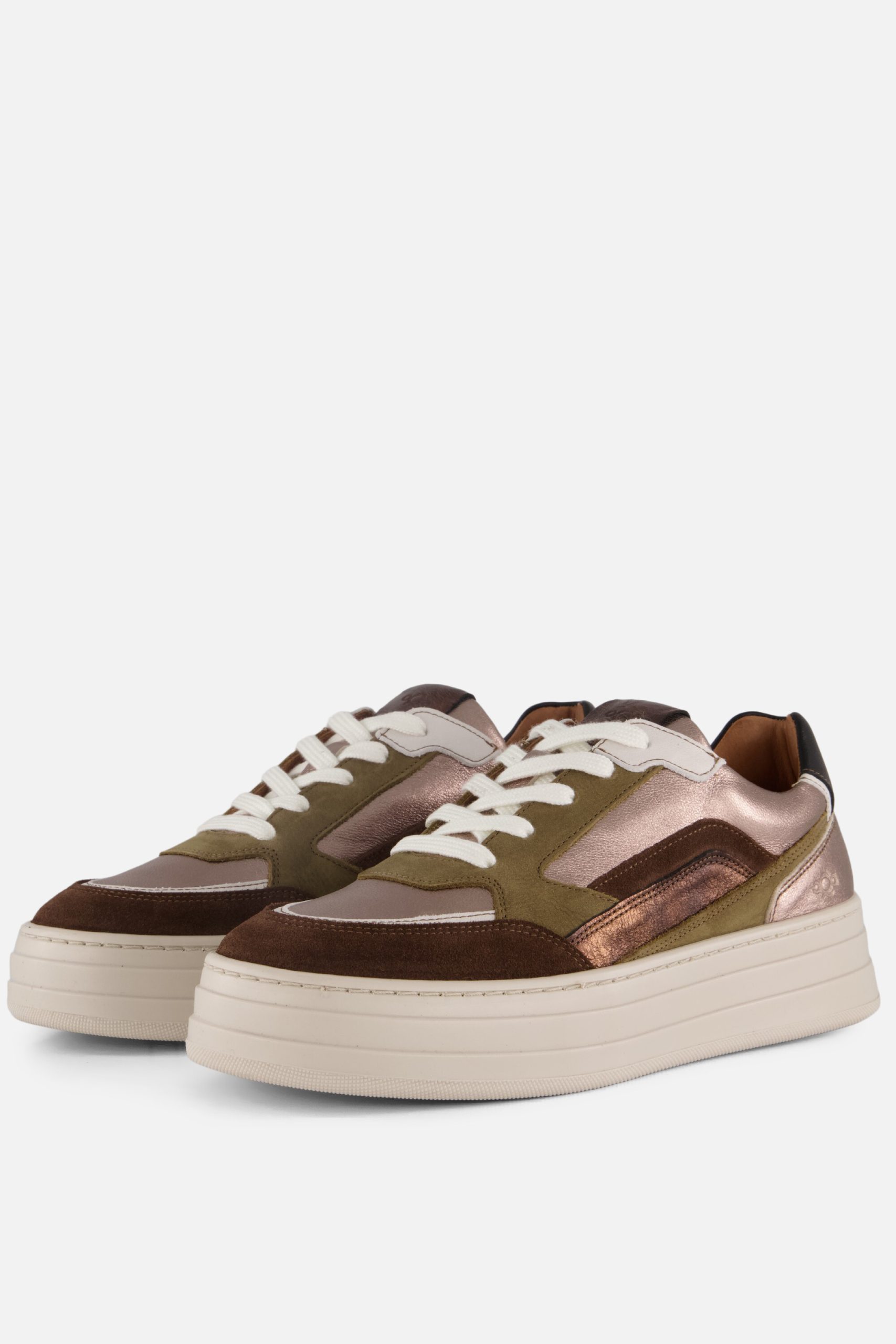 De AQA sneakers voor dames zijn uitgevoerd in glanzend bronskleurig leer en hebben zowel een leren bovenkant als binnenvoering. Dit zorgt voor een luxe uitstraling en hoog draagcomfort. Met hun moderne design zijn deze sneakers eenvoudig te combineren en ideaal voor dagelijks gebruik.