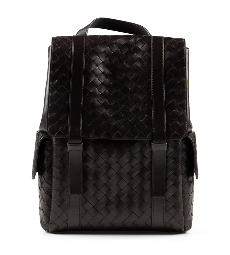 Back to School Backpack Fondant/Silver by Bottega Veneta Intrecciato leather backpack Two exterior flap pockets Single interior laptop compartment and two open pockets Flap closure Material: calfskin Lining: Canvas Hardware: Silver finish