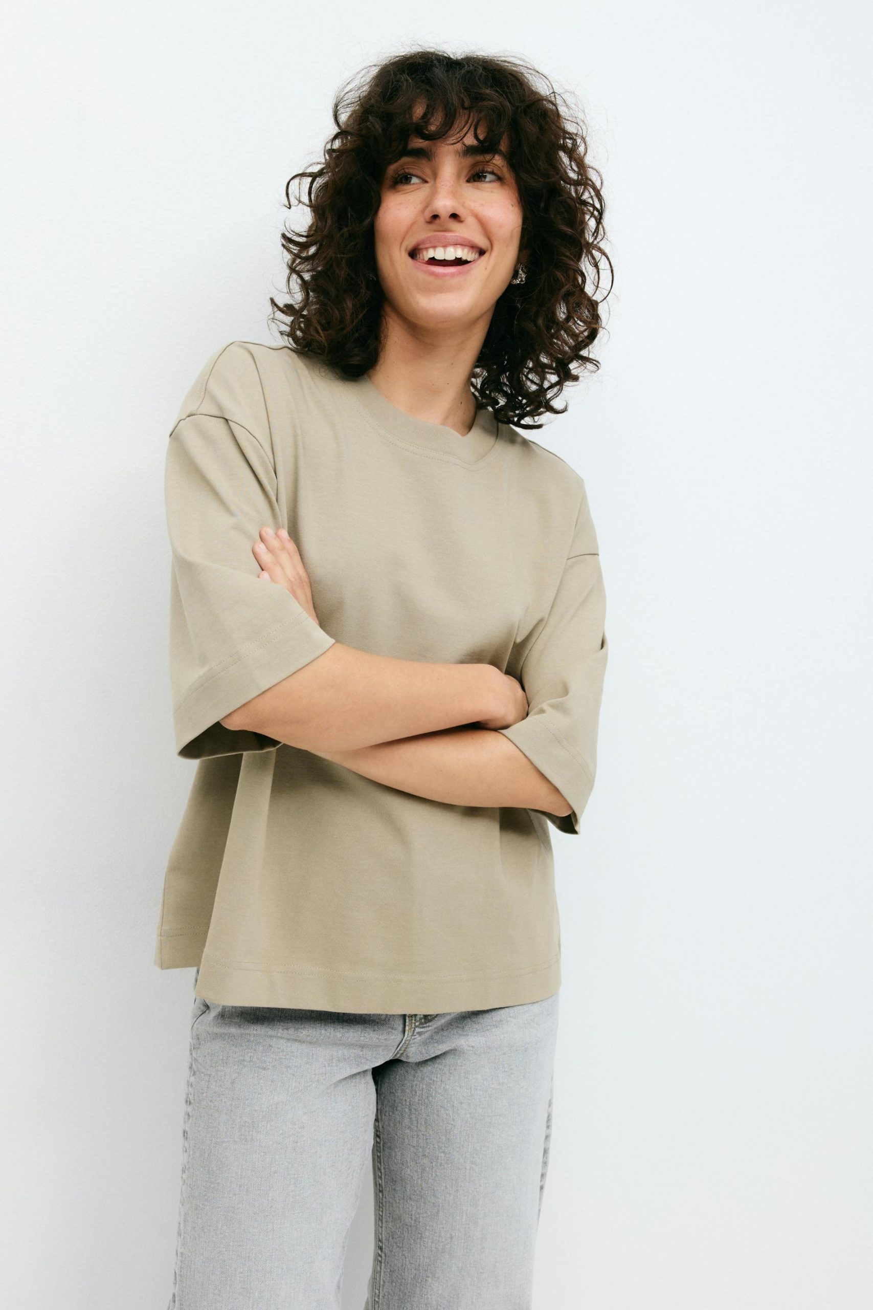 Boxy t-shirt van katoen met overmaatse pasvorm. Het t-shirt is beige en heeft afgesneden lengte. Het heeft korte mouw en ronde en geribbelde neklijn.