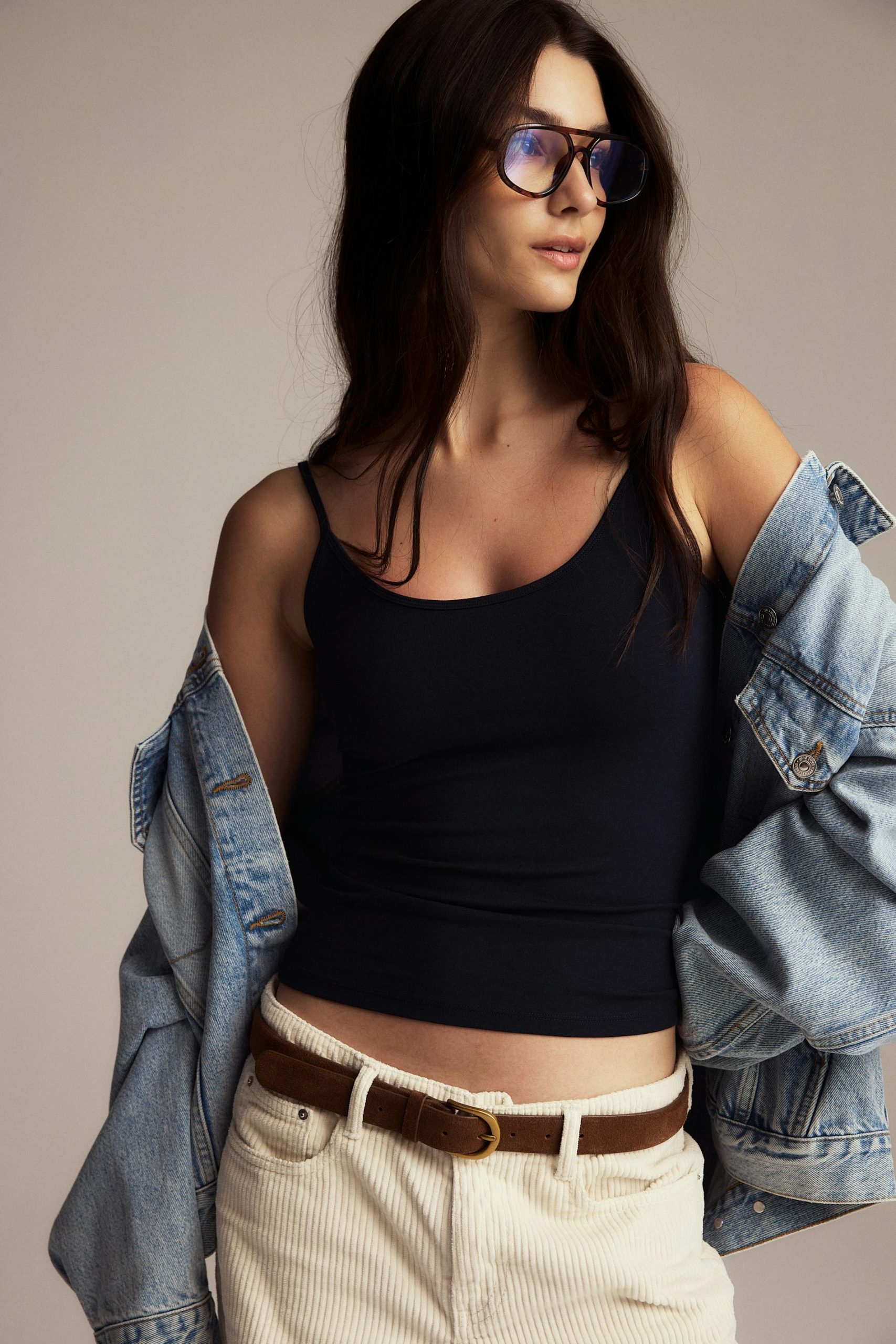 Hemdje van zachte jersey met nauwsluitende pasvorm. Het hemdje is blauw en heeft dunne en elastische schouderriemen. Het heeft normale lengte en diepe neklijn.