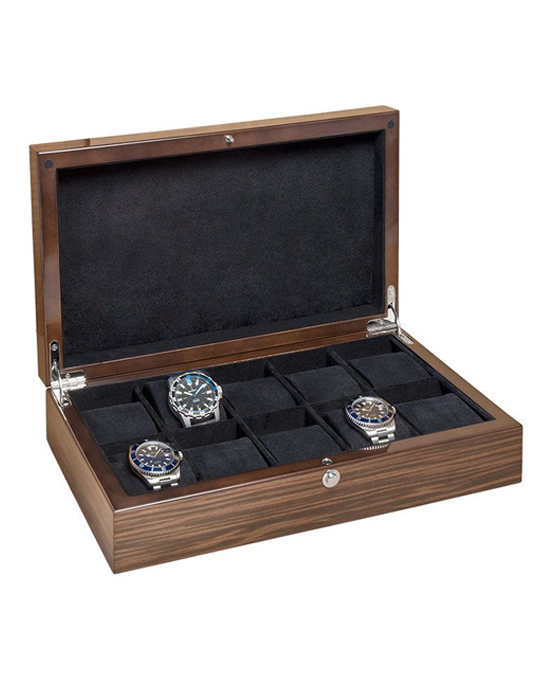 De Beco Technic Makassar 10 is een solide horlogekist voor 10 horloges, met een diameter tot 56 mm. Topkwaliteit in een strakke vormgeving, voor de echte liefhebber of horlogeverzamelaar. Materiaal: massief hout, van binnen zwart fluweel. Uitgevoerd met edelstalen scharnieren. Kleur: makassar donkerbruin, zijdeglans gelakt Sluiting: afsluitbaar met stevige drukknopsluiting Afmetingen: 340 x 220 x 80 mm Gewicht: 2,1 kg