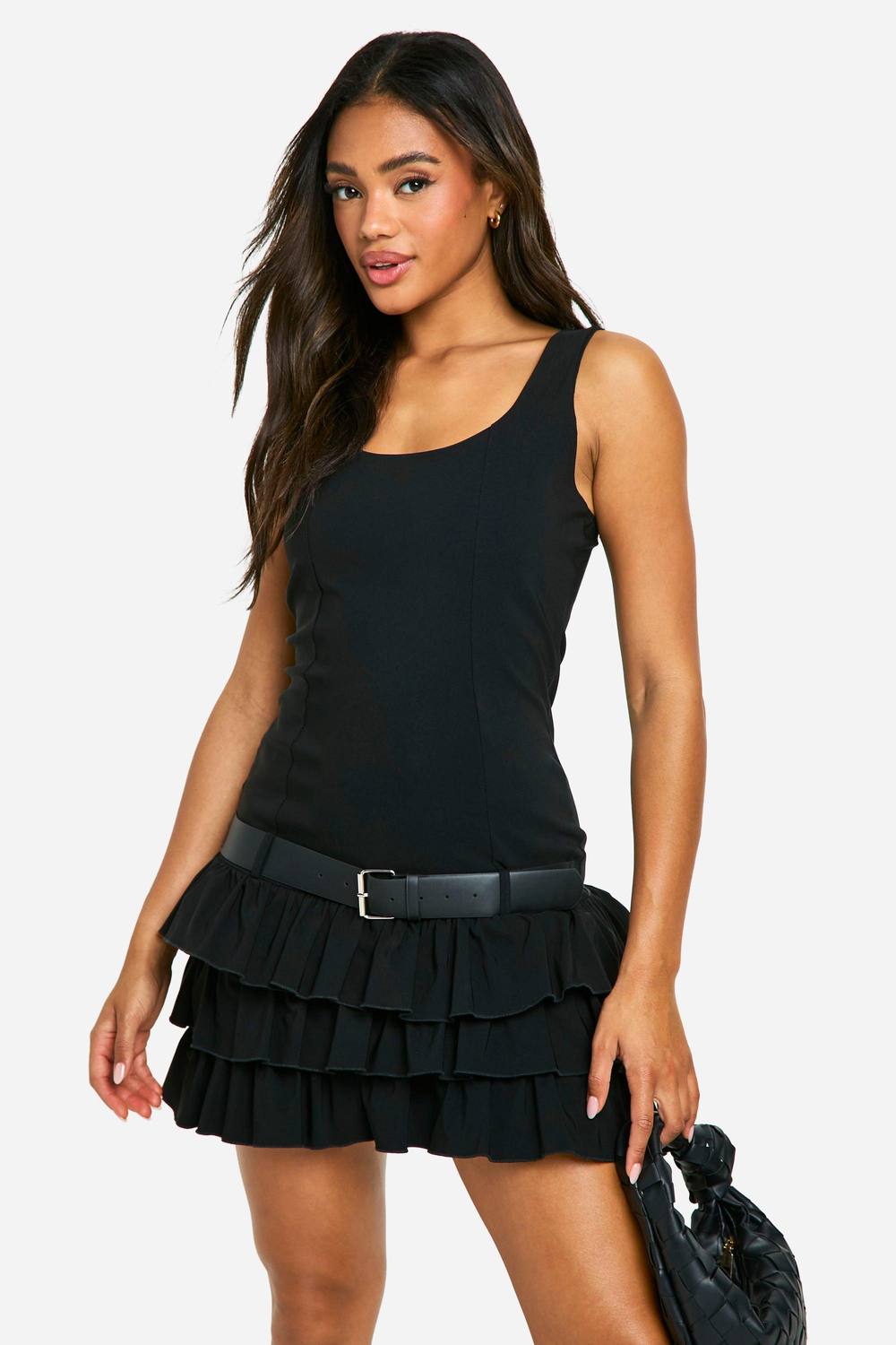 Scoop-halslijn voor een flatterend silhouet Mouwloos ontwerp, perfect voor warmere dagen Nauwsluitende bengaline stof met stretch Gelaagde ruchesrok voor een speelse touch Ceintuurdetail aan de taille voegt definitie toe Maak een statement in deze chique ruchesminijurk van Boohoo. De strakke, lijfhervormende pasvorm, vervaardigd uit bengaline stof, omarmt je rondingen op precies de juiste plaatsen, terwijl de gelaagde ruchesrok een flirterige uitstraling toevoegt. Perfect voor informele uitstapjes of familiebijeenkomsten, kan dit veelzijdige stuk moeiteloos zowel casual als chic gestyled worden. Combineer het met sneakers en een spijkerjas voor een relaxte look overdag, of kies voor sandalen met bandjes en opvallende oorbellen voor een avondje uit met vriendinnen. De scoop-halslijn en het mouwloze ontwerp houden je koel en comfortabel, waardoor het een ideale keuze is voor warme zomerdagen. Met zijn mix van stijl en comfort zal deze jurk zeker een favoriet worden in je garderobe voor diverse informele gelegenheden. boohoo Dames Bengaline Ruffle Mini Jurk | Black | Maat: 42