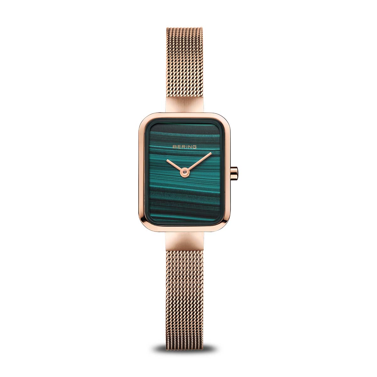 De nieuwe Petite Square collectie van Bering is werkelijk prachtig! Er is een keuze uit vijf verschillende kleuren en vallen vooral op door het edele en minimalistische Square design. Dankzij het gebruik van hoogwaardige materialen zoals parelmoer, malachiet en krasbestendig saffierkristal zijn ze niet alleen ideaal om dagelijks te dragen, maar verfraaien ze ook op discrete wijze elke look. De groene wijzerplaat is gemaakt van Malachit.