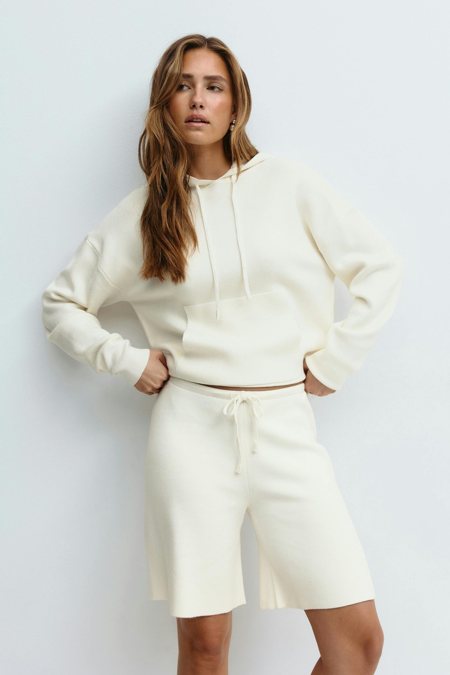 Gebreide bermuda met zelfbinder aan de voorkant. De short is wit en heeft rechte pijpen. Het heeft midden taille en elastiek aan de taille.