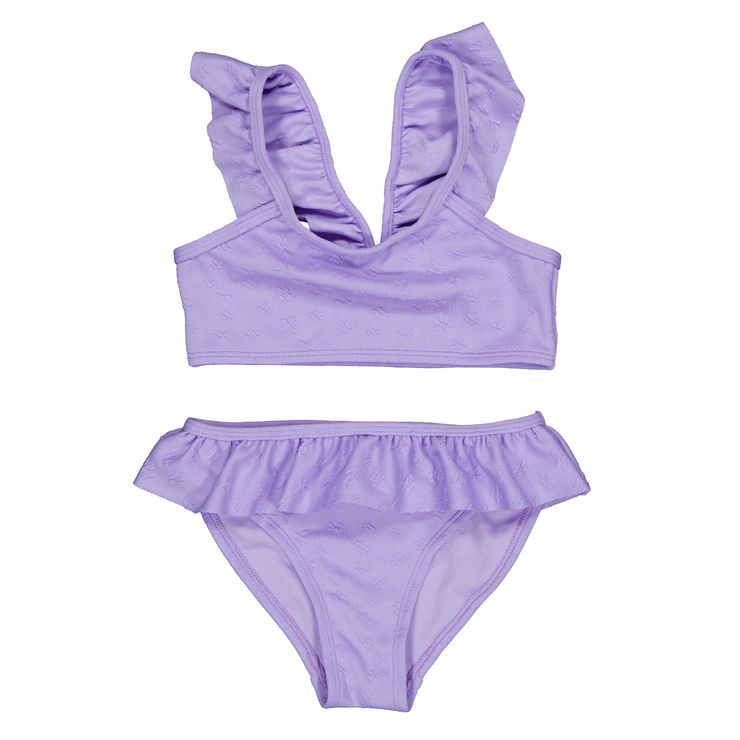 Dit paarse bikini voor meisjes is gemaakt van 90% polyester en 10% elastaan, met een voering van 100% polyester. De jacquard stof is zacht en heeft een all-over print. De top heeft schouderbanden met een knusse plooien en de broek is afgewerkt met een speelse volant, wat zorgt voor een vrolijke uitstraling. Deze bikini is ideaal voor een dag bij het water.