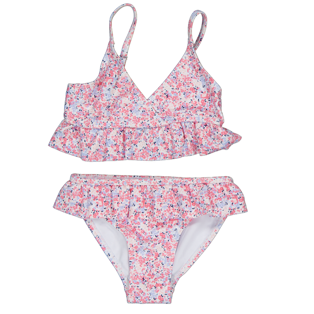 Dit setje bikini voor meisjes is leuk met een vrolijk all-over bloemenpatroon. Het is gemaakt van een comfortabele mix van polyamide en elastaan, wat zorgt voor een goede pasvorm. De top heeft schattige ruffles en verstelbare bandjes. Perfect voor plezier in het water.