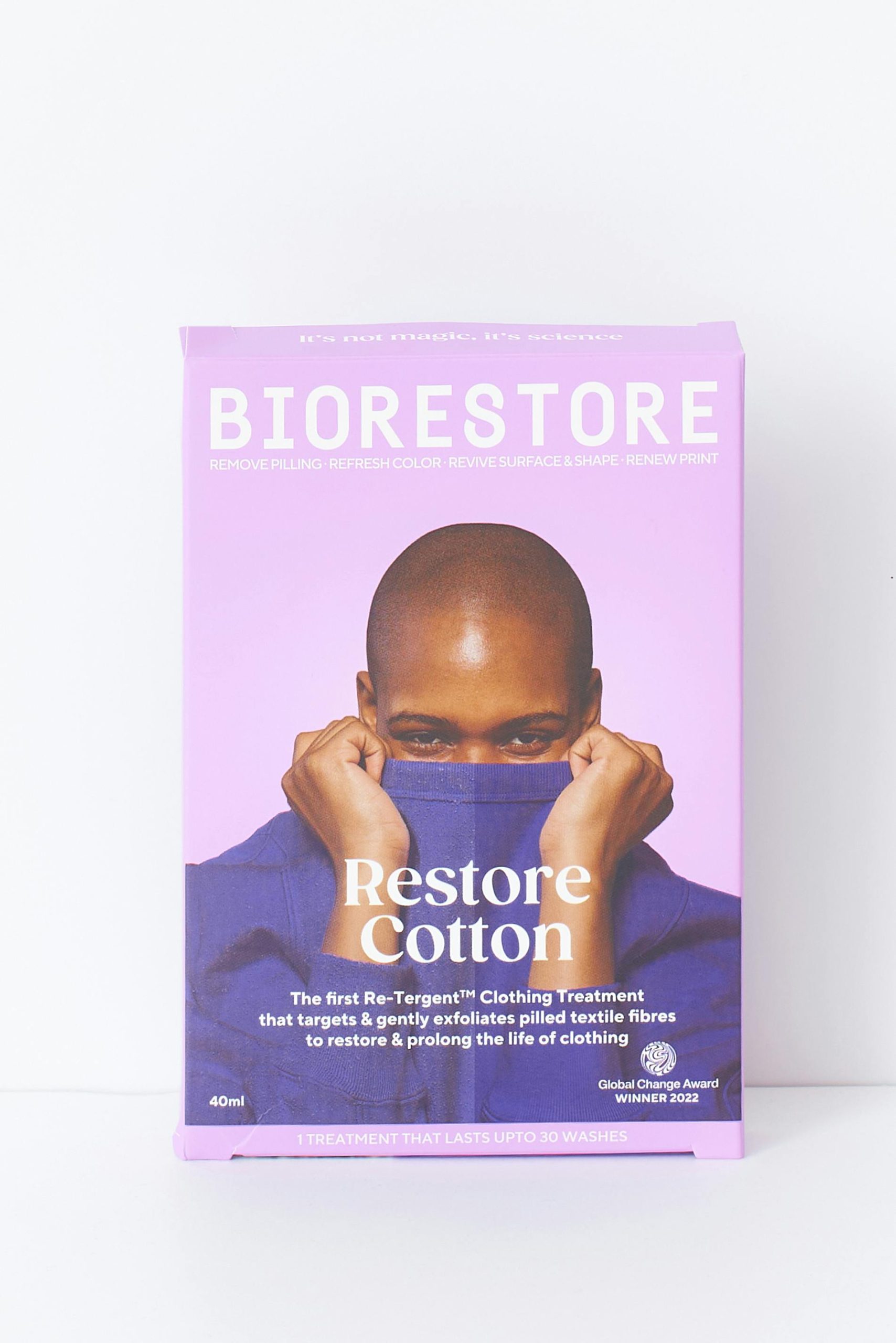 BIORESTORE cotton is an Award-Winning and Patent-Pending Laundry Treatment to remove lint, pilling, and fading from your clothes made of at least 70% cotton. The eco-friendly formula makes your clothing fuzz-free, smooth, and vibrant in only one home laundry wash, while also reviving it’s texture and softness for 30x washes.