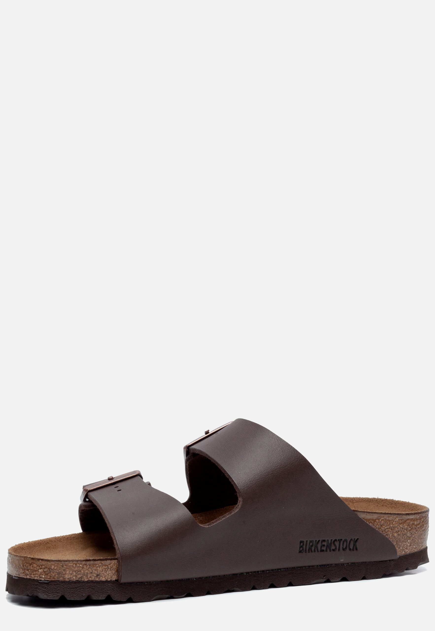 Bruine Birkenstock Arizona slippers met een kurken voetbed met daarop een binnenzool van suède. Deze combinatie van materialen zorgt ervoor dat de imitatieleren Birkenstock slippers optimaal comfort en ondersteuning bieden voor jouw voeten. De Birkenstock Arizona slippers zijn voorzien van twee brede banden met verstelbare riempjes waardoor de slippers af te stellen zijn aan de vorm van de voeten. Aan de binnenzijde van de slippers zit een merkopdruk. De Birkenstock slippers hebben een normale tot brede leest.
