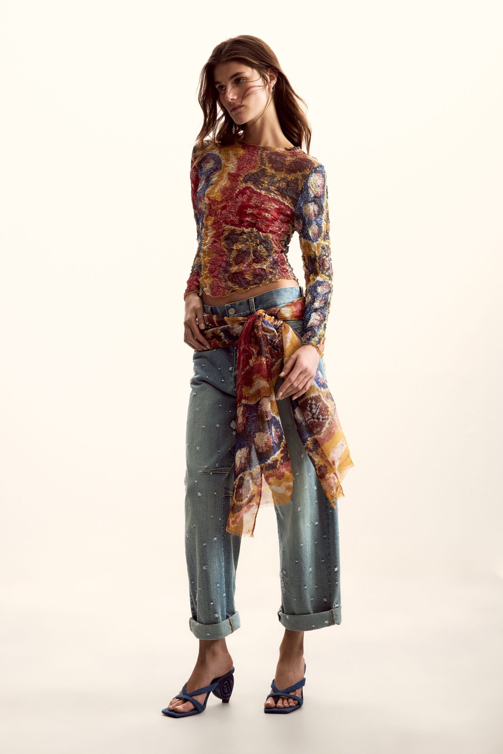 Blouse van synthetische mix-georgettestof, ronde hals en lange mouwen. Heeft een etnische print in mosterdtinten met zichtbare stikdetails.