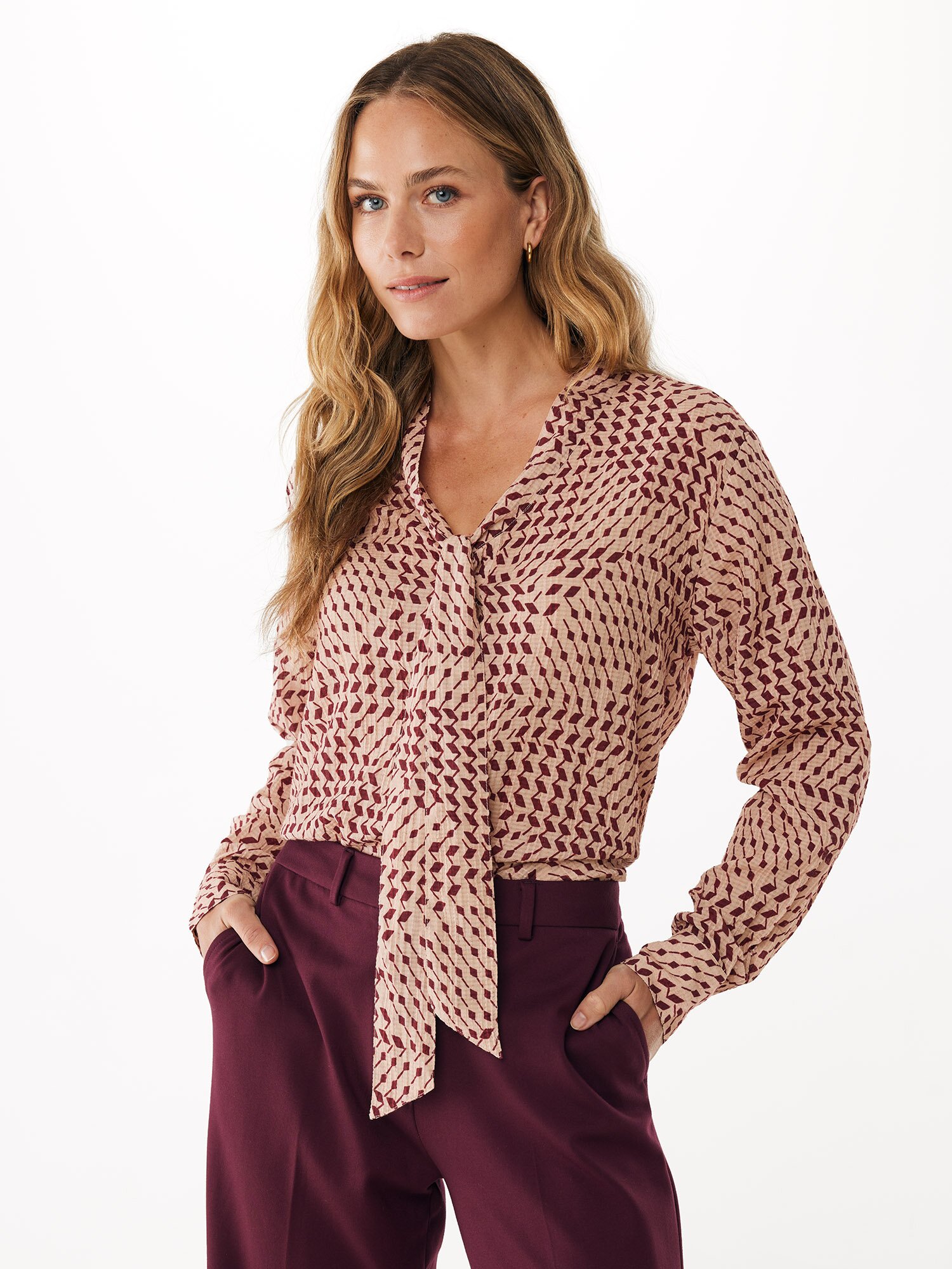 Deze stijlvol vormgegeven blouse in donkerrood heeft een elegante strik en biedt een grafische print die voor een moderne look zorgt. Gemaakt van viscose, voelt het zacht aan op de huid en heeft het een comfortabele pasvorm. De blouse heeft een doorknoopsluiting en lange mouwen, ideaal voor veelzijdige outfits. Combineer met een donkerrood pantalon of jeans voor een slimme, casual look. Ontdek meer in decollectie dameskleding.