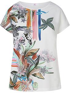 Blouseshirt van EMILIA LAY met loshangende schouders. Voorkant van vloeiende stof in 100% polyester met een geprint motief. Achterkant van zachte, effen jersey van 95% viscose, 5% elastaan. LENZING™ ECOVERO™ viscose is een geregenereerde cellulosevezel. Lengte in maat 42 ca. 65 cm. Deze blouse is machinewasbaar. wasbaar tot 30°. chloorbleken niet mogelijk. warm strijken. chemische reiniging. drogen in de droger niet mogelijk. 40, 42, 44, 46, 48, 50, 52, 54, 56