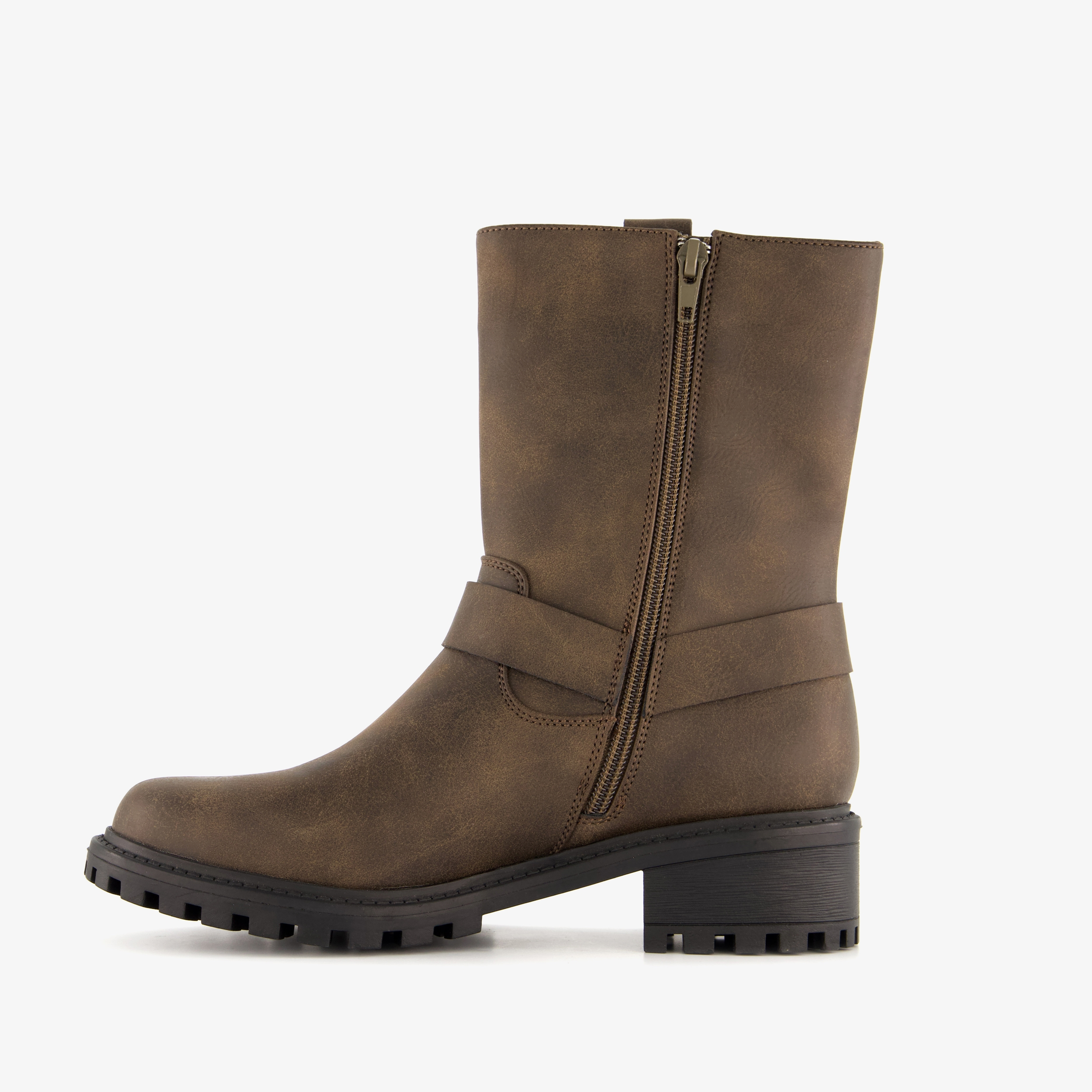 Bruine biker boots voor dames. Gemaakt van imitatieleer, een binnenwerk van textiel en een rubberen zool. De boots hebben een ritssluiting aan de binnenzijde en een decoratieve gesp rondom de schoen. Het vaste voetbed is gemaakt van imitatieleer. De stoere biker boots hebben een schachthoogte van 19 cm en een lage hak van circa 2,5 cm.
