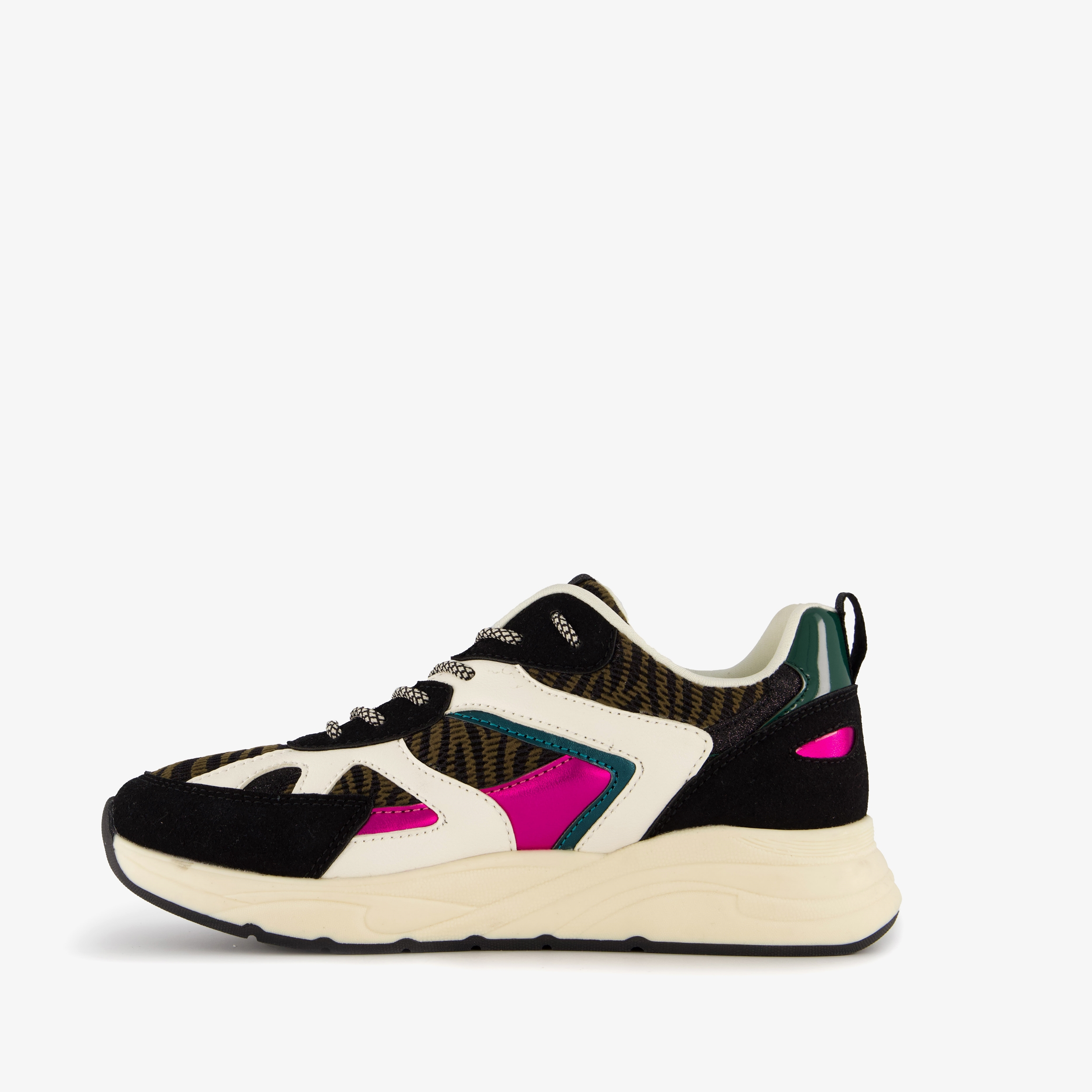 Zwarte dad sneakers voor dames. Gemaakt van imitatieleer, een binnenwerk van textiel en een rubberen zool. De sneakers hebben een vetersluiting en uitneembaar voetbed van imitatieleer. Voorzien van zebraprint op het bovenwerk en roze en turquoise accenten.