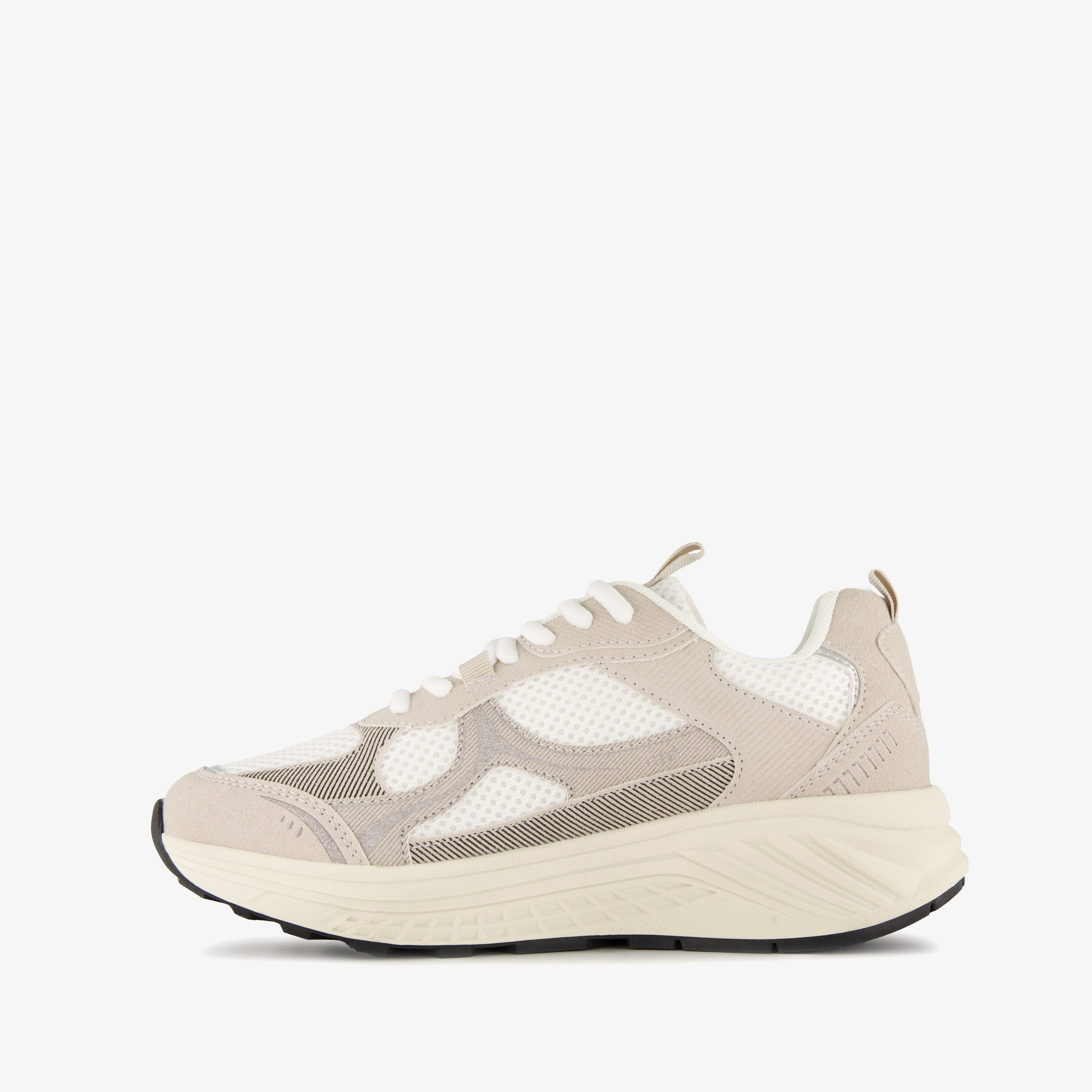 Witte dad sneakers voor dames. Gemaakt van imitatieleer, een binnenwerk van textiel en een rubberen zool. De sneakers hebben een vetersluiting en hiellusje. Het voetbed is uitneembaar en gemaakt van textiel. Voorzien van mesh inzetten op het bovenwerk en grijze details.