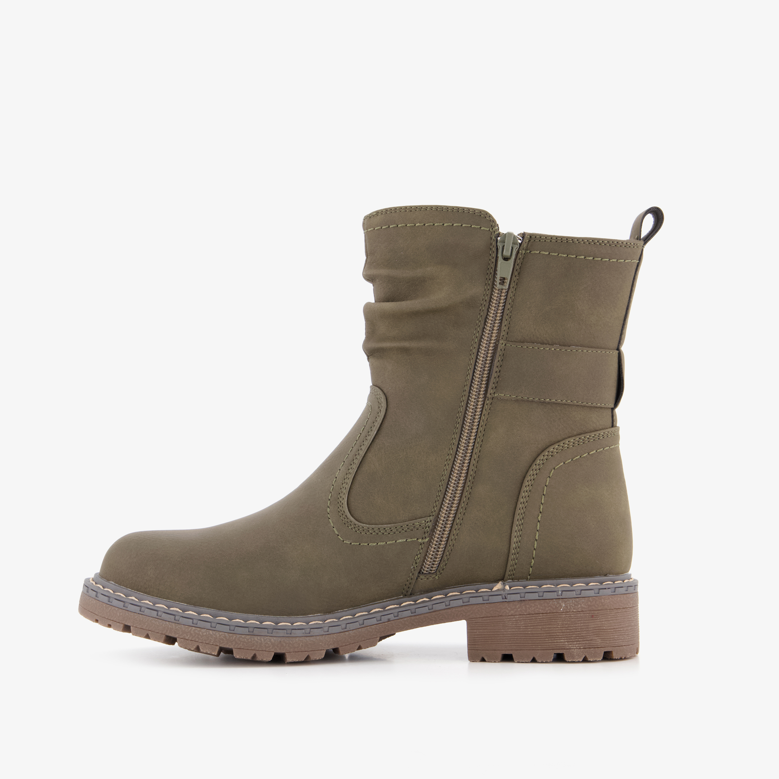 Kaki enkellaarsjes voor dames van Blue Box. Met een boven- en binnenwerk van imitatieleer en een rubberen zool. De laarsjes hebben een rits, hiellusje en gesp. Het vaste voetbed is gemaakt van imitatieleer. De schachthoogte bedraagt 16 cm.