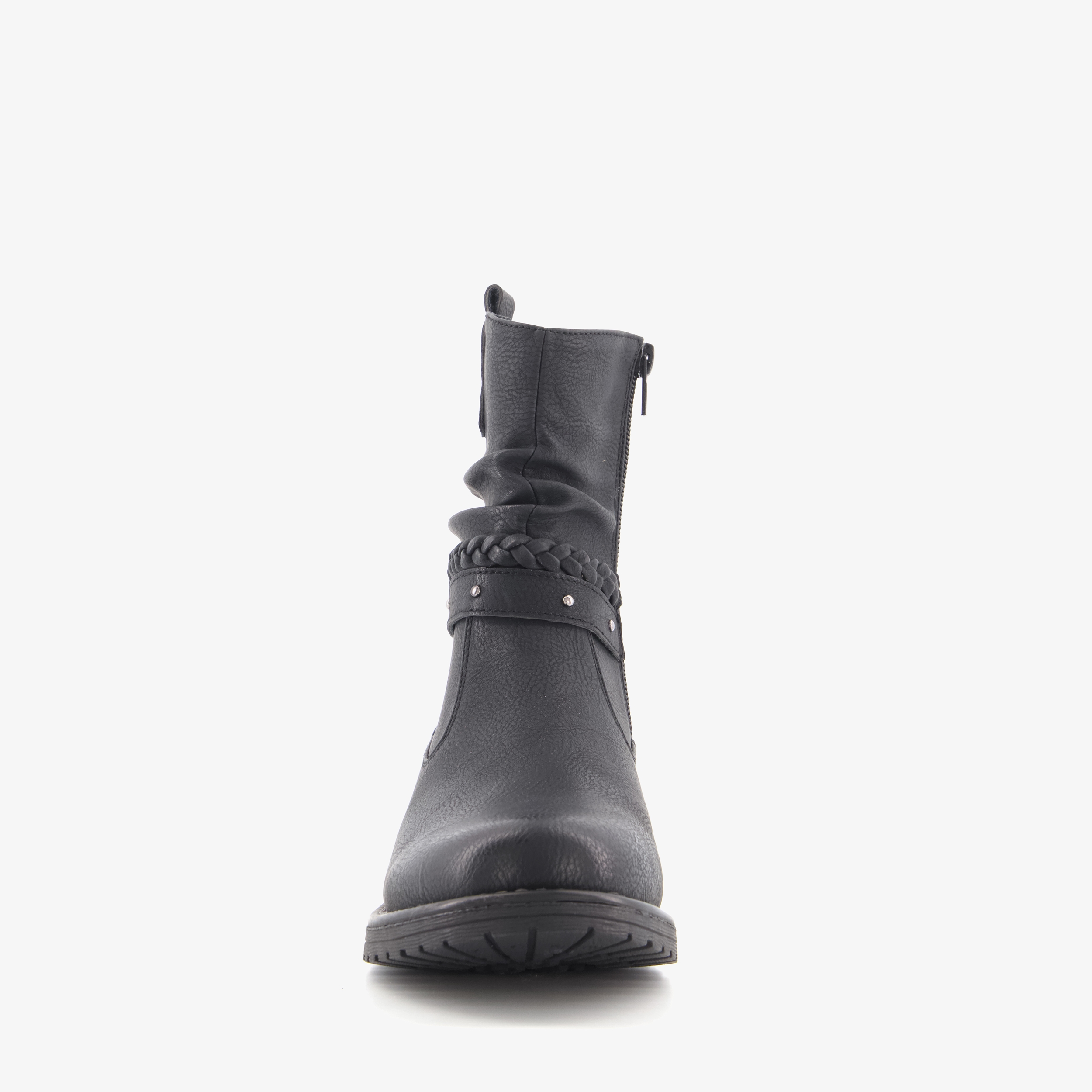 Zwarte enkellaarsjes voor dames van Blue Box. Gemaakt van imitatieleer, een binnenwerk van textiel en een stevige profielzool. De platte laarsjes hebben een ritssluiting aan de binnenzijde en decoratieve bandjes rondom de schacht. Het vaste voetbed is gemaakt van textiel. De enkellaarsjes hebben een schachthoogte van 16 cm en een lage hak van circa 2 cm.