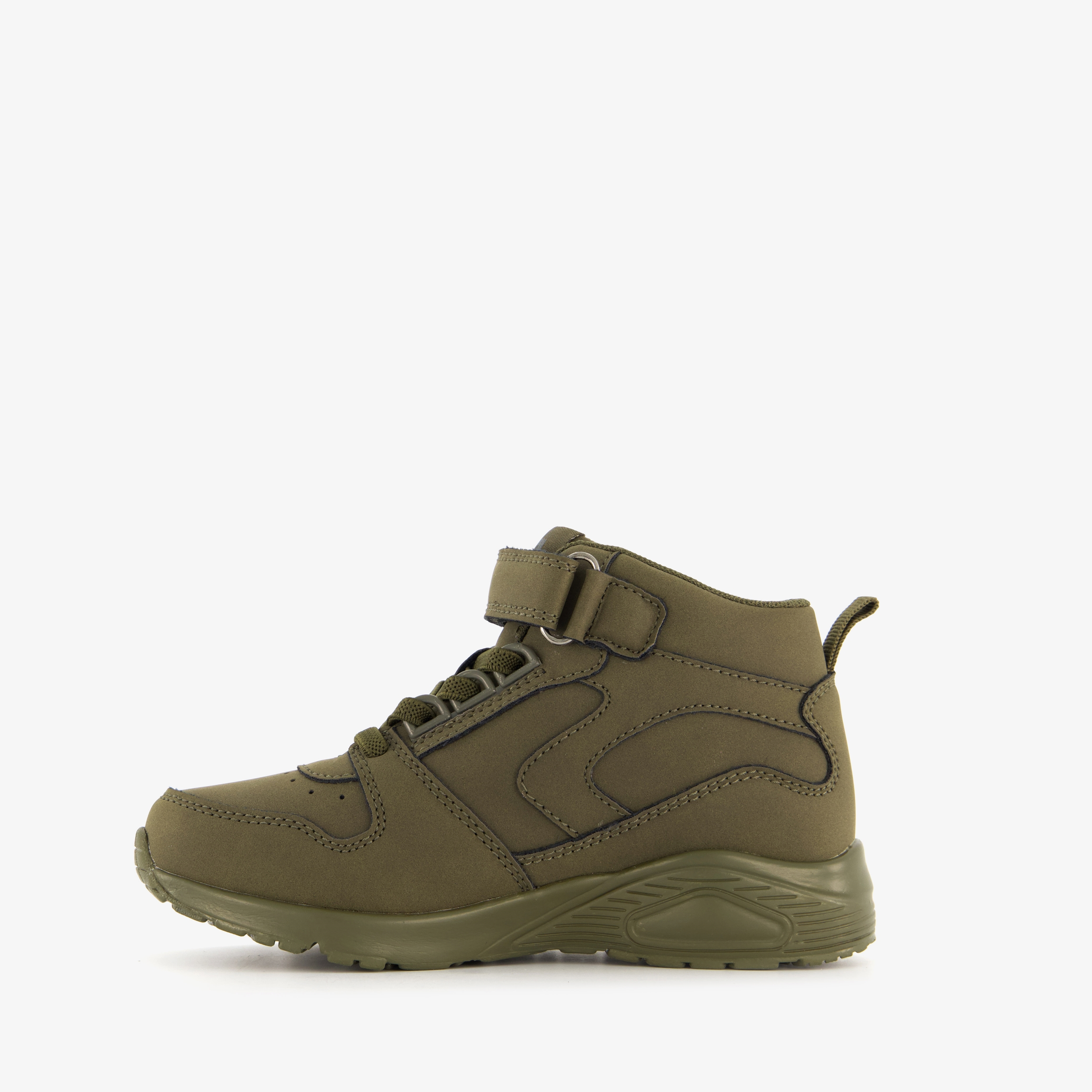 Hoge, donkergroene sneakers voor jongens. Gemaakt van imitatieleer, een binnenwerk van textiel en een rubberen zool. De sneakers hebben elastische veters, klittenbandsluiting en een aantreklusje op de hiel. Het uitneembare voetbed is gemaakt van textiel. De hoge sneakers hebben witte details en een airzool.