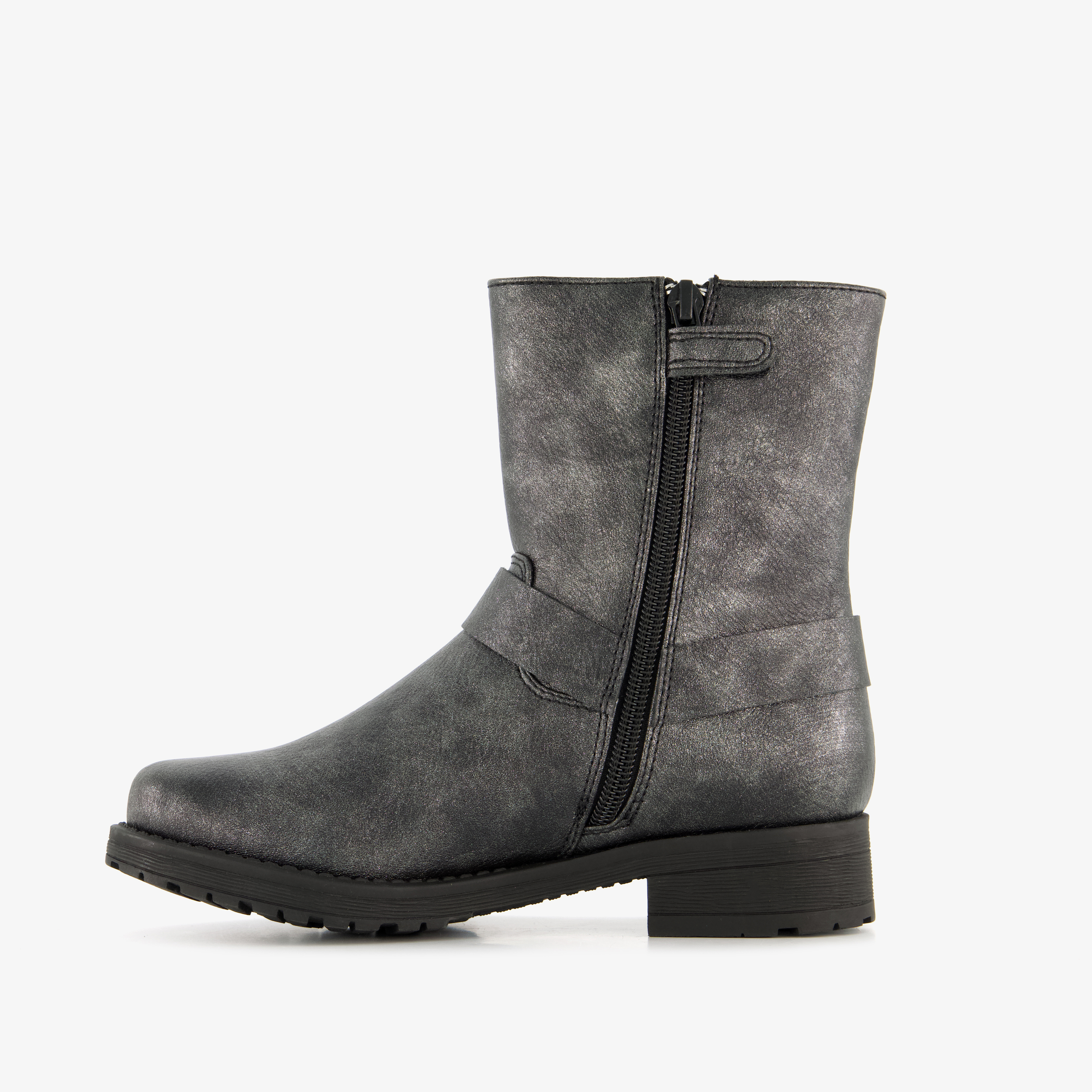 Antraciet zilverkleurige biker boots van Blue Box. Met een boven- en binnenwerk van imitatieleer en een rubberen zool. De boots hebben een ritssluiting aan de binnenzijde en een gesp met studs. Het vaste voetbed is gemaakt van textiel. De biker boots hebben een schachthoogte van 14 cm.
