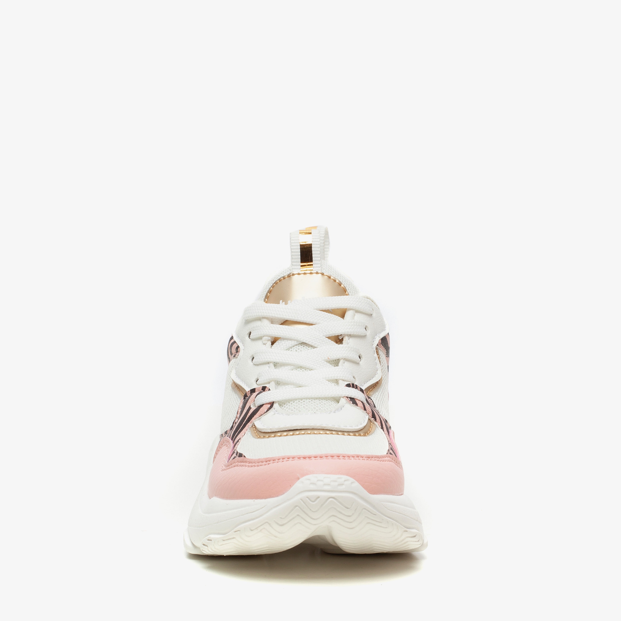 Chuncky, witte dad sneakers voor meisjes. Deze stoere sneakers zijn gemaakt van textiel en imitatieleer, hebben een binnenwerk van textiel en een stevige buitenzool van rubber. De binnenzool is gemaakt van textiel, deze is uitneembaar. De sneakers hebben vetersluiting en een handig aantreklusje op de hak. Voorzien van roze inzetten op het buitenwerk en subtiele zebraprint details.