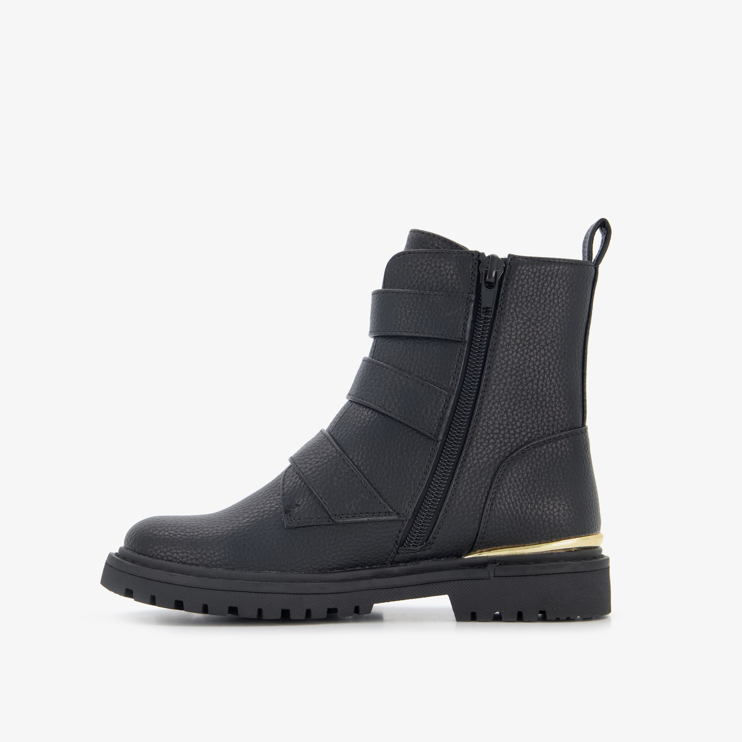 Zwarte enkellaarsjes met goudkleurige gespen in de vorm van hartjes van Blue Box. Het buiten- en binnenwerk zijn gemaakt van imitatieleer, en de stevige zool met profiel is van rubber. De laarsjes zijn voorzien van een ritssluiting en bandjes met gespsluitingen aan de buitenzijde voor een optimale pasvorm. Ze hebben hiellusjes voor een makkelijke instap en een schachthoogte van 11 cm. De binnenzool is niet uitneembaar.