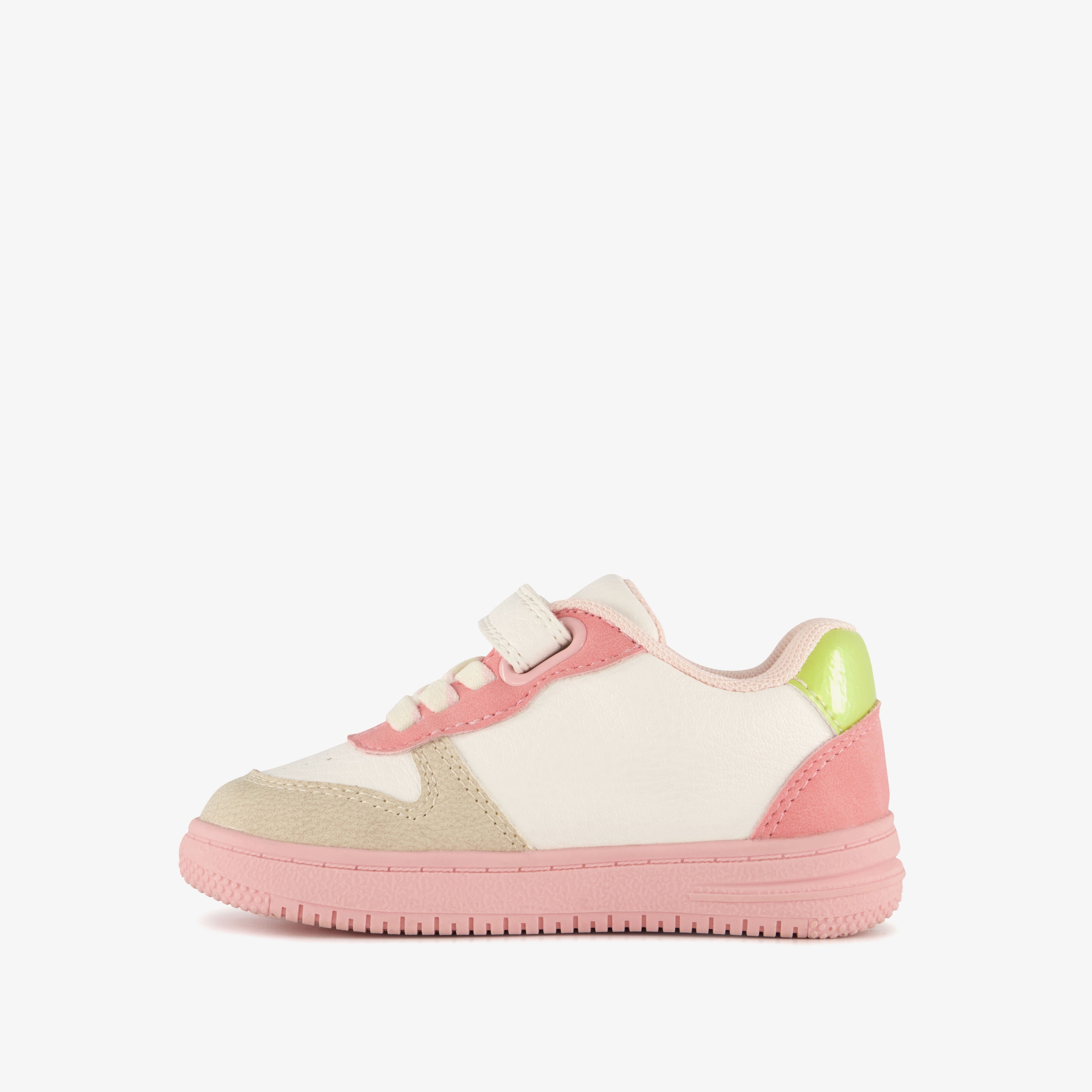 Pastel roze meisjes sneakers van Blue Box. Het buitenwerk is gemaakt van imitatieleer, het binnenwerk van textiel en de stevige zool met profiel is van rubber. Voorzien van elastische veters en een klittenband voor een optimale pasvorm en een makkelijke instap. Het comfortabele voetbed van textiel is niet uitneembaar. Het buitenwerk van deze mooie meisjes sneakers wordt versierd met groene en beige accenten.